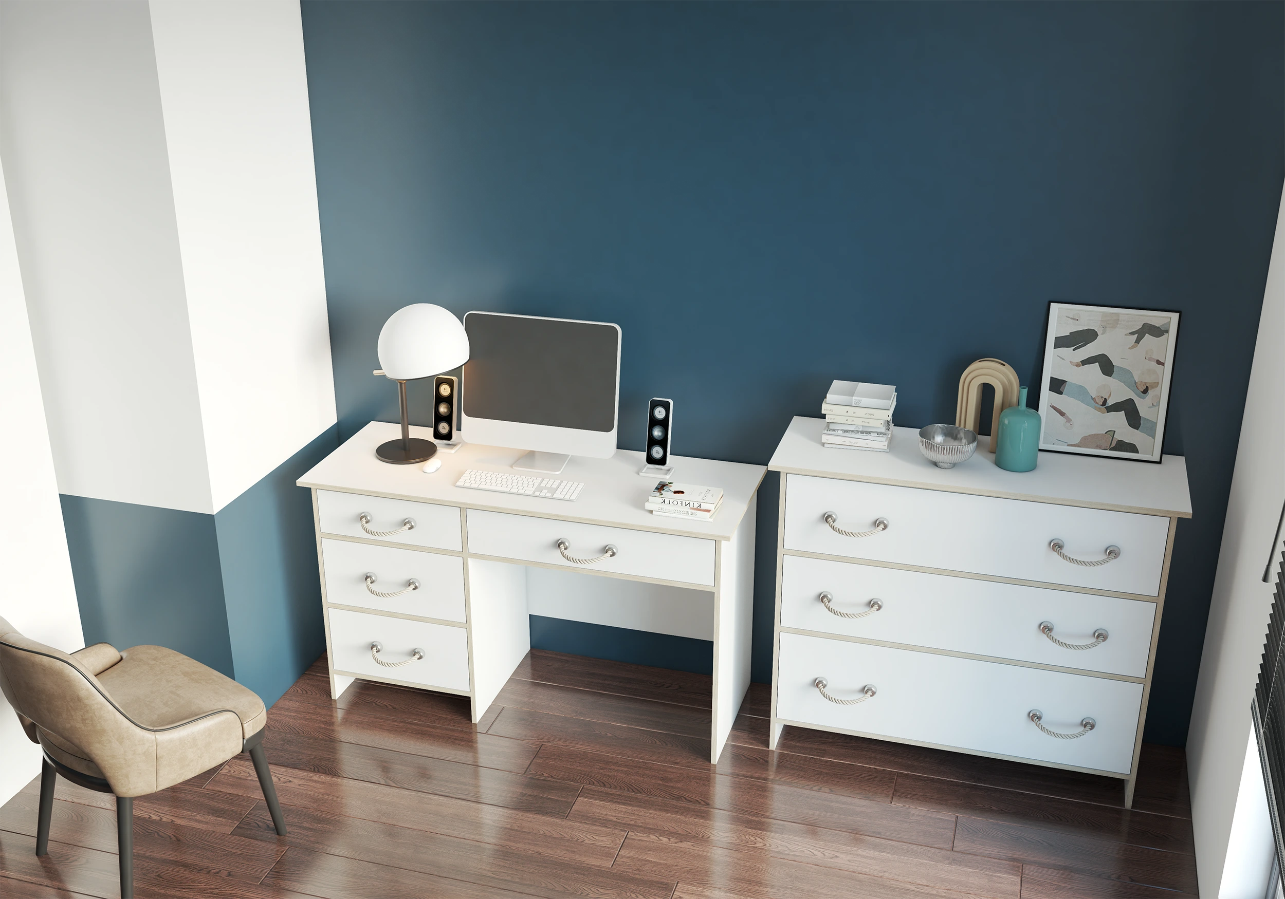 Meble z kolekcji FLARON charakteryzują dekoracyjne uchwyty sznurkowe w stylu marynarskim. Korpus i fronty wykonane są z płyty laminowanej 16 mm najwyższej jakości. Obrzeża wykończone okleiną ABS, która chroni meble przed zarysowaniami, uszkodzeniami, wilgocią i wysoką temperaturą. Korpus oraz fronty wykonane są w kolorze białego matu. Obrzeża mebli natomiast są w kolorze dąb sonoma. Komplet składa się z brył takich jak: biurko, regał, komoda, szafa, stolik nocny, łóżko o powierzchni spania 90×200 cm oraz stelaż drabinkowy do łóżka.