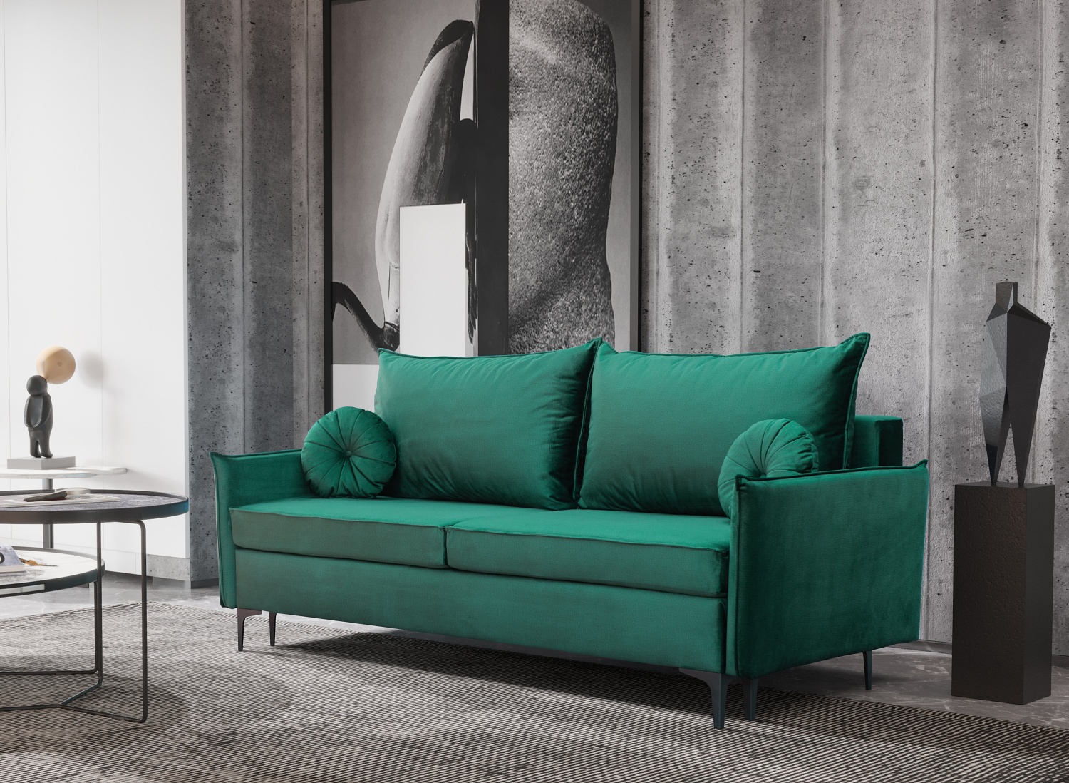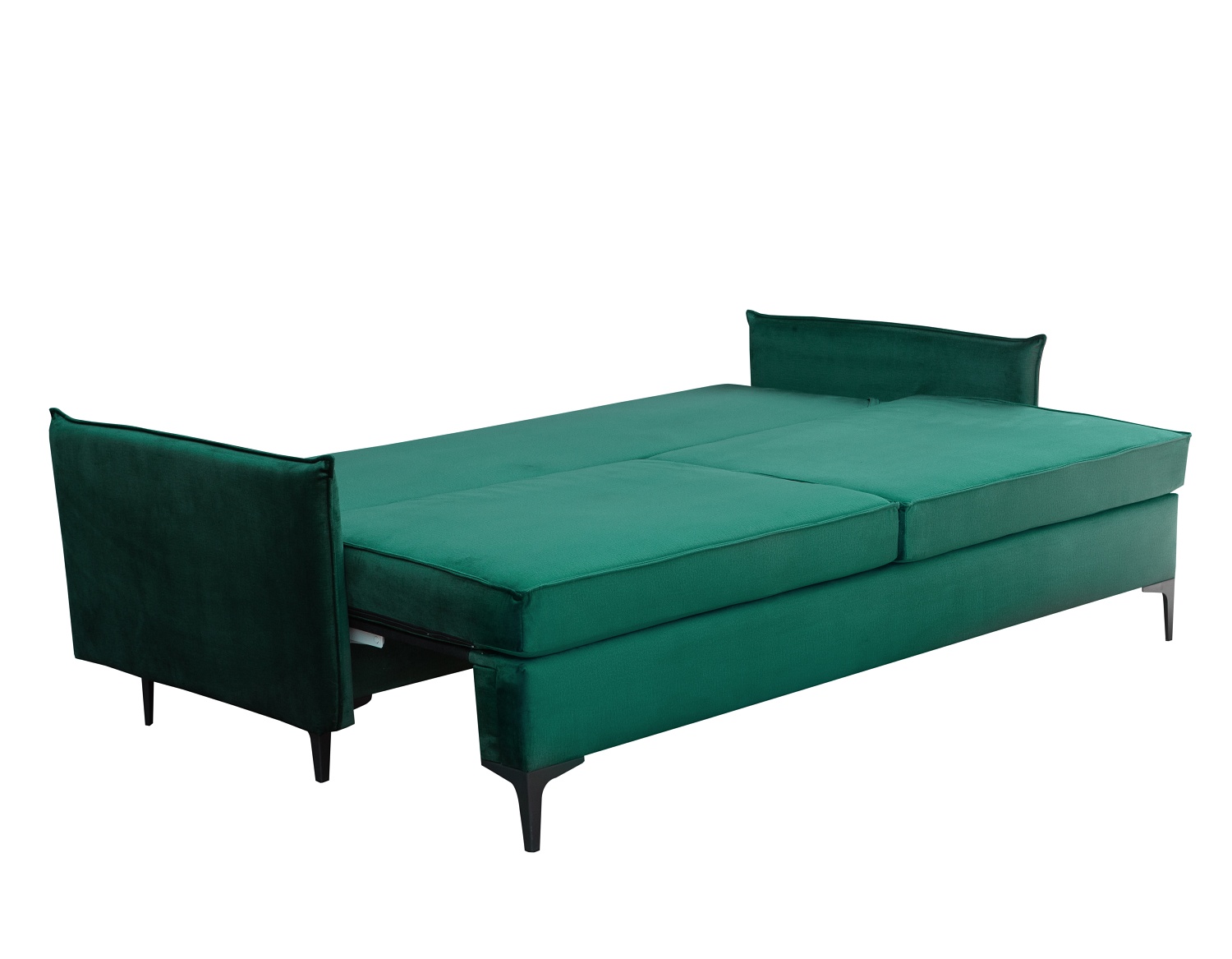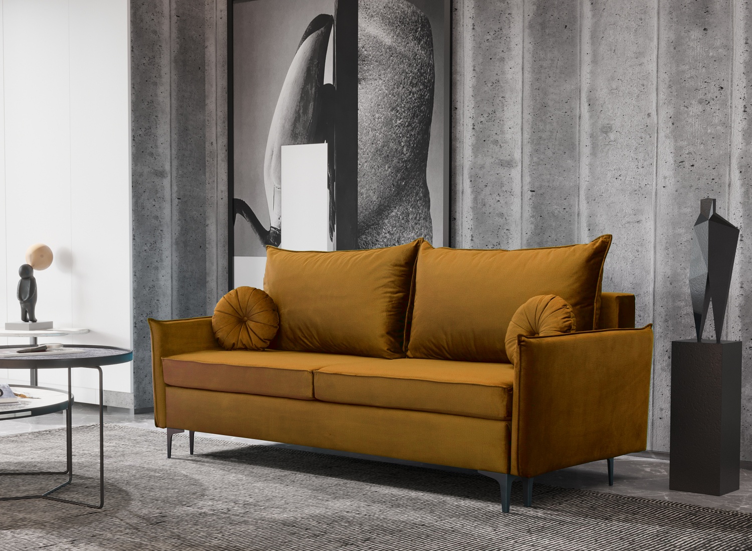 Kanapa została wyposażona w sprężyny bonellowe, które gwarantują odpowiednie podparcie i sprężystość zarówno podczas siedzenia, jak i snu. Choć model nie posiada pojemnika na pościel, jego kompaktowa forma i wygodne siedzisko czynią go idealnym wyborem do codziennego użytkowania. Co istotne, tapicerowany tył kanapy pozwala na jej swobodne ustawienie również na środku pomieszczenia, dzięki czemu mebel doskonale prezentuje się z każdej strony.