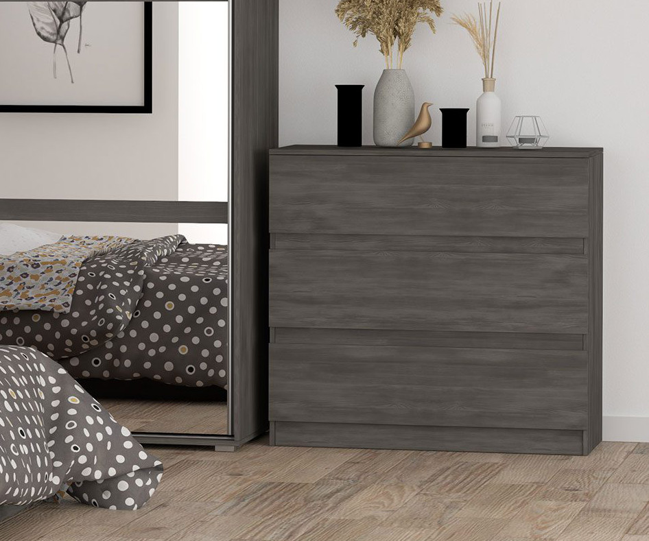 Komoda Nefra wyposażona jest w trzy pojemne szuflady, które doskonale sprawdzą się do przechowywania odzieży, dokumentów czy innych niezbędnych drobiazgów. Dzięki temu, że mebel łączy funkcjonalność z estetyką, wprowadza do przestrzeni porządek, a przy tym nie przytłacza wnętrza. Komodę możesz łatwo zestawić z innymi elementami z tej samej kolekcji, tworząc spójny i praktyczny zestaw do sypialni lub pokoju dziennego.
