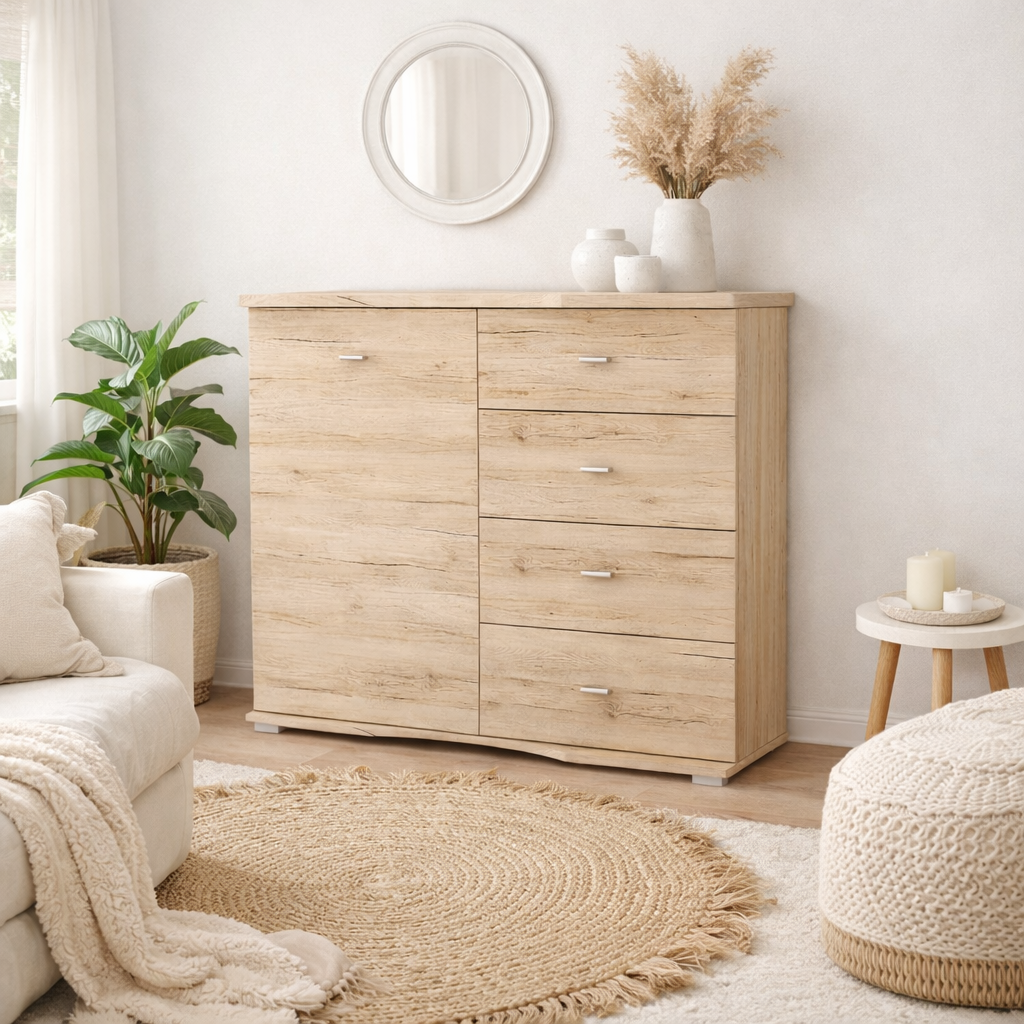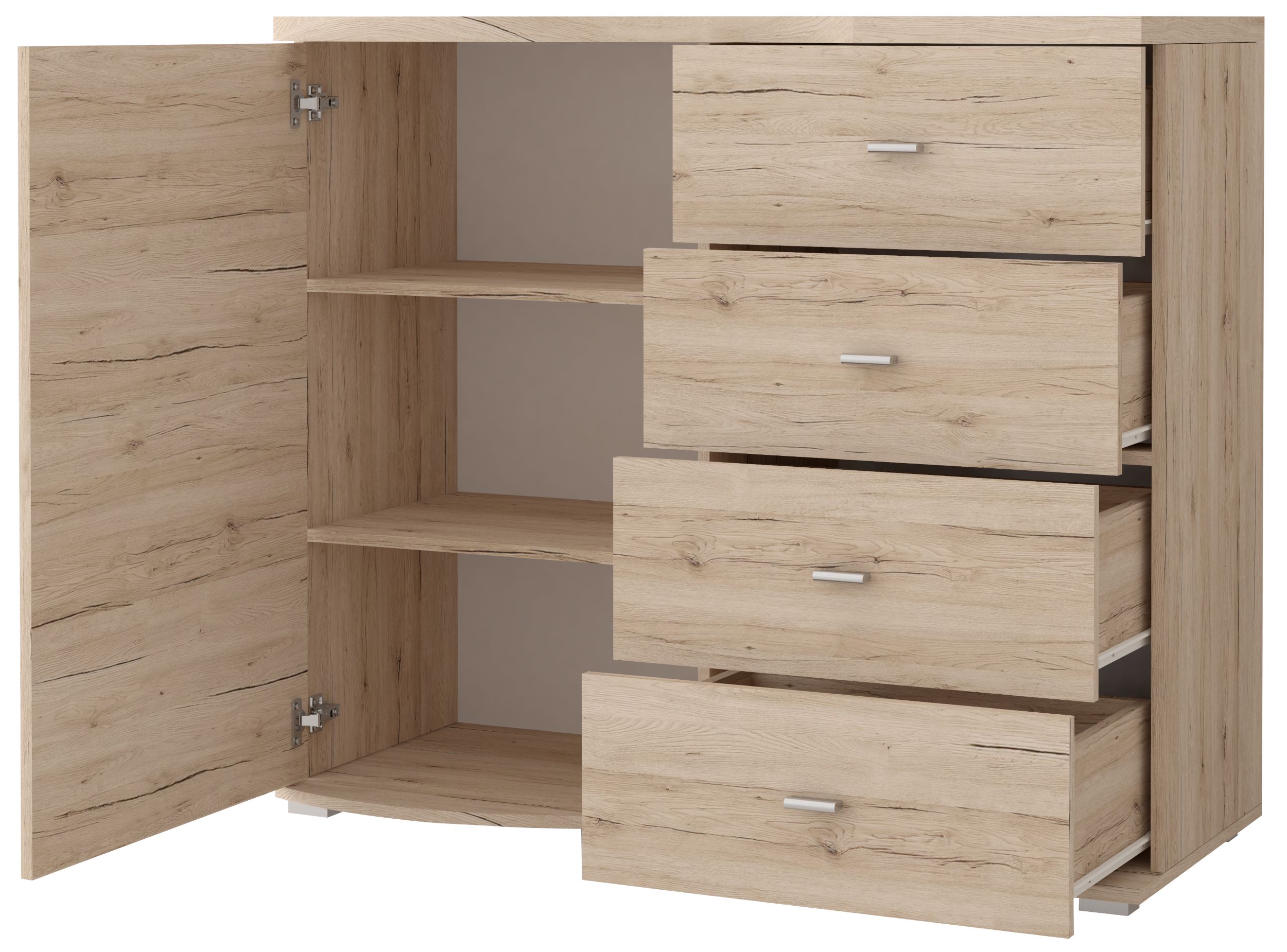 Komoda wykonana jest z trwałych materiałów, które imitują drewno dębu san remo. Jej jasnobrązowy kolor z charakterystycznymi, wyraźnymi słojami nadaje jej naturalny wygląd i wprowadza do wnętrza ciepłą atmosferę. Komoda wyróżnia się nowoczesną, modną stylistyką czyniącą z niej element pożądany w każdym współczesnym domu. Produkt wykonano z mocnej płyty laminowanej, czyli materiału cenionego nie tylko za piękny wygląd, ale także znakomitą trwałość. Krawędzie konstrukcji dodatkowo wzmocnione zostały trwałym obrzeżem ABS, które zapobiega wchłanianiu wilgoci.