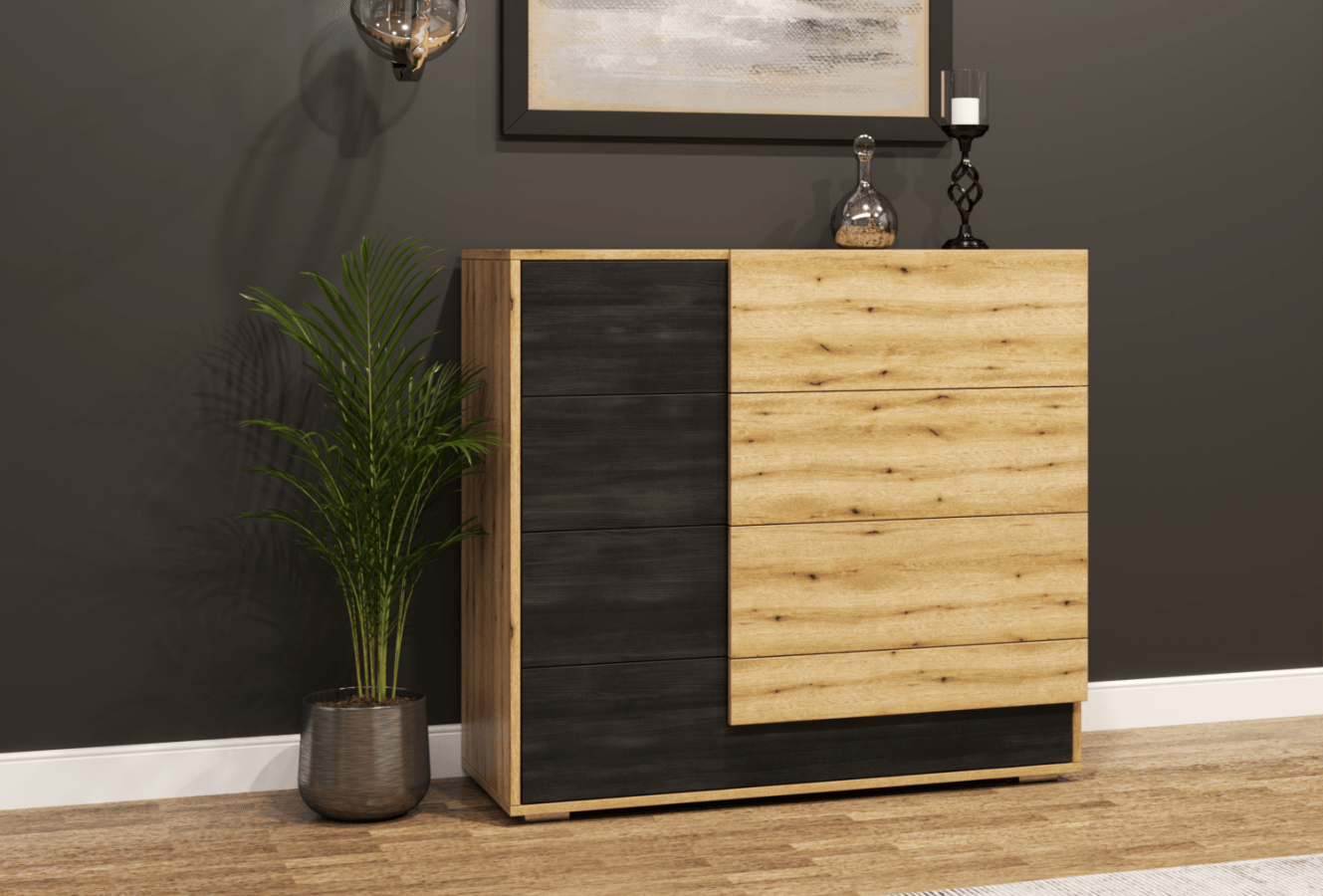 Wyjątkowa kolorystyka łącząca dąb artisan z czarnym matem sprawia, że mebel doskonale odnajduje się w stylistyce loftowej, ale także urozmaici bardziej stonowane wnętrza. Materiały użyte do produkcji komody to płyta laminowana o grubości 16 mm, odporna na zarysowania, promieniowanie UV i działanie wilgoci. Dzięki temu mebel zachowuje swój estetyczny wygląd na długie lata. Elementy w czarnym macie dodają jej wyrazistości, a naturalna struktura drewna wnosi ciepło i przytulność do każdego pomieszczenia.