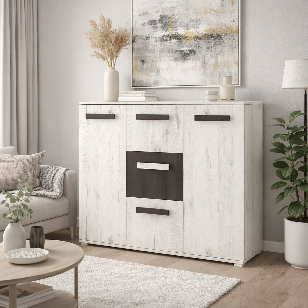 Komoda Viva wyposażona została w trzy głębokie szuflady oraz dwie szafki z dwoma półkami w środku. Dodatkowo na górnym blacie komody możesz wyeksponować ulubione przedmioty! Na uniwersalny i nowoczesny styl komody wpływa zastosowana kolorystyka oraz prosty kształt. Detalem dekoracyjnym są drewniane uchwyty. W sprzedaży posiadamy również meblościankę Nova, dzięki której możemy stworzyć spójną całość. Nietuzinkowe połączenie kolorów w postaci dębu craft białego z czarną sosną norweską wniesie do wnętrze charakteru.