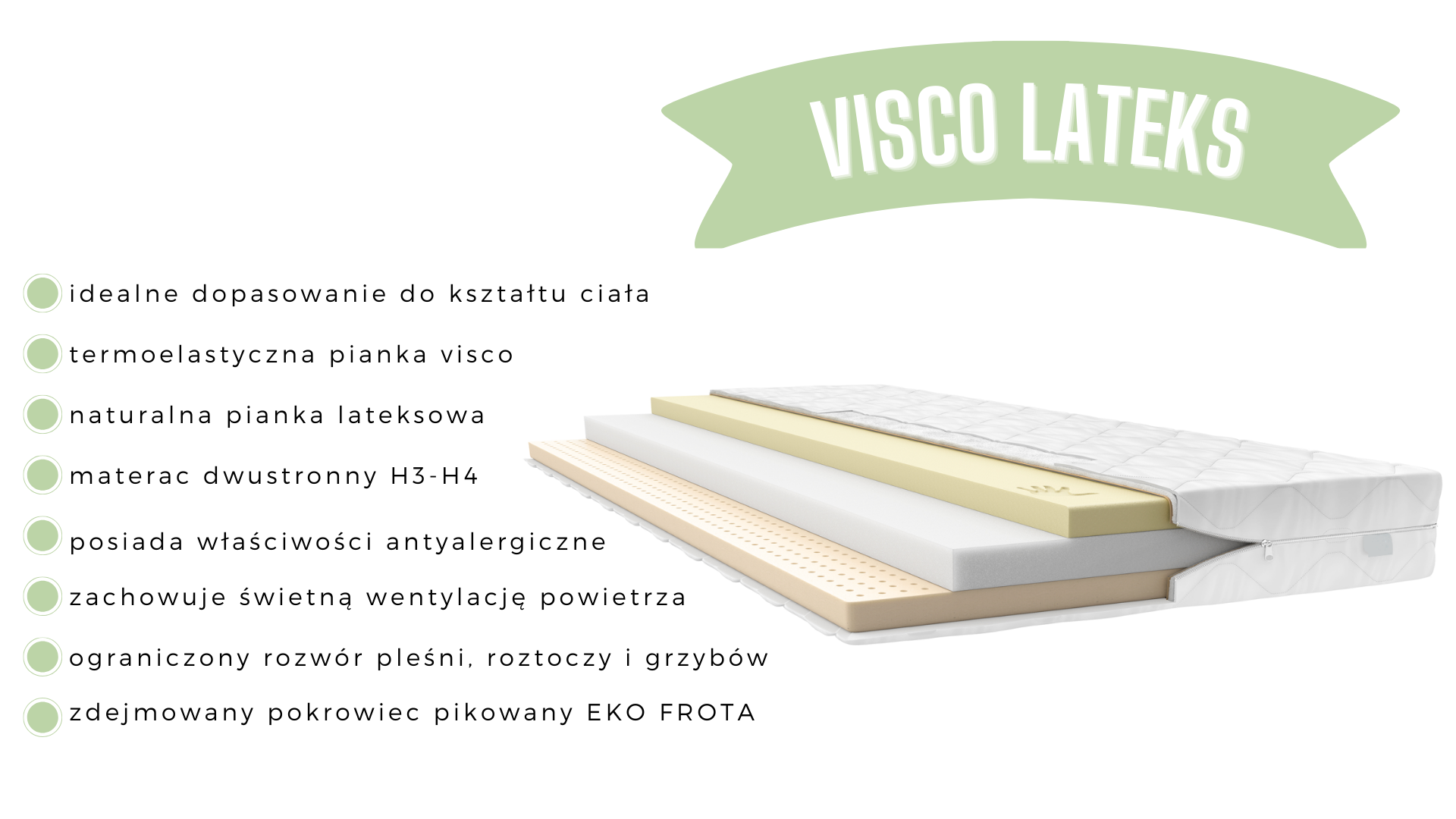 Dwustronny ekskluzywny materac z wkładem piankowym, który z jednej strony posiada piankę termoplastyczną VISCO a z drugiej matę lateksową. Jest to ŚREDNIO TWARDY materac, odpowiedni zarówno dla dzieci jak i dla dorosłych. Przeznaczony dla osób ceniących stabilny, wygodny sen z naciskiem na właściwości antyalergiczne oraz dopasowanie do ciała.