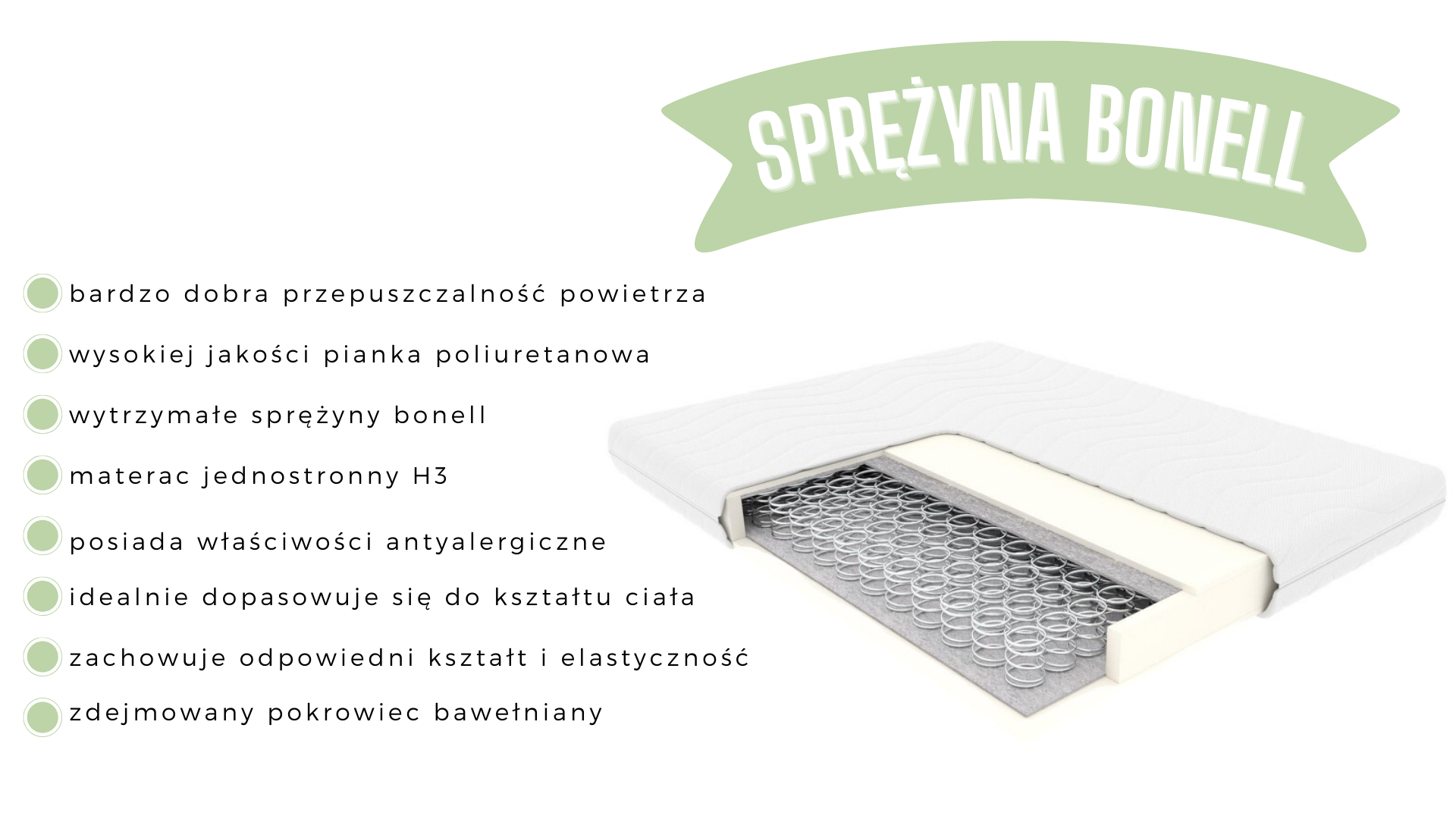 Zbudowany na bazie wysokiej jakości sprężyny typu bonell, której główną zaletą jest elastyczność powierzchniowa sprawiająca, że materac nadaje się dla osób w dużym przedziale wagowym. Przy połączeniu jej z bardzo dobrej jakości pianką poliuretanową o podwyższonej wytrzymałości otrzymujemy bardzo dobry i uniwersalny materac w rozsądnej cenie.