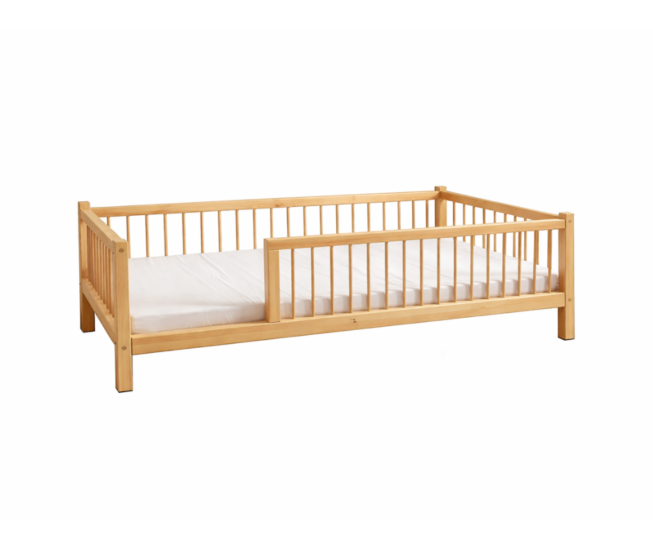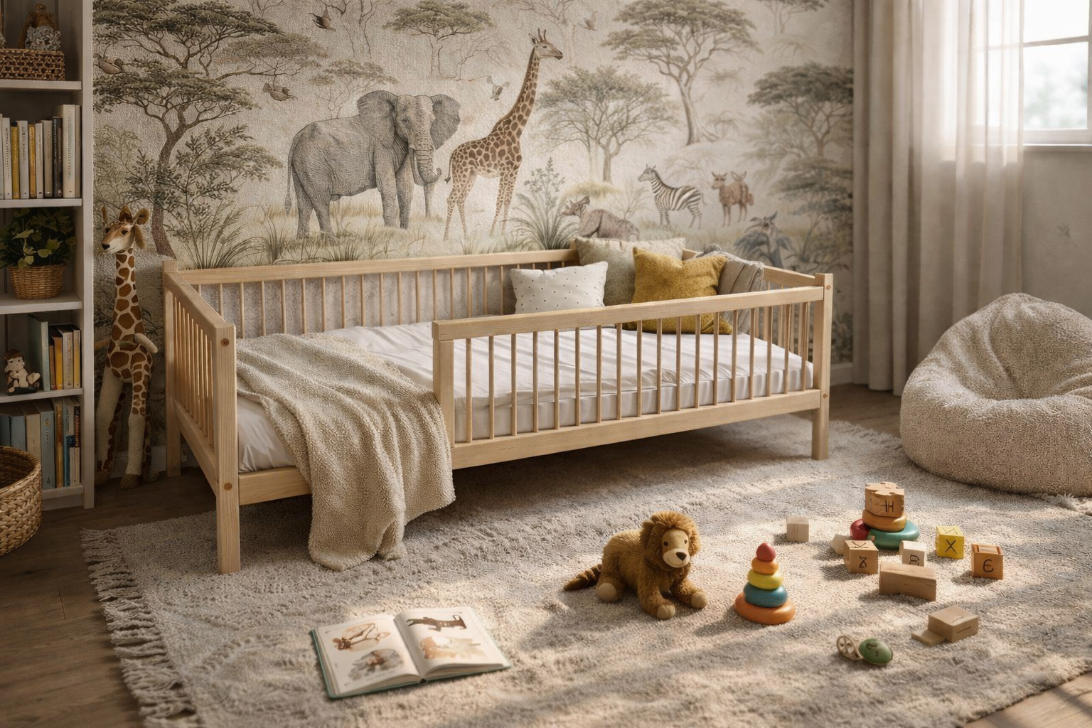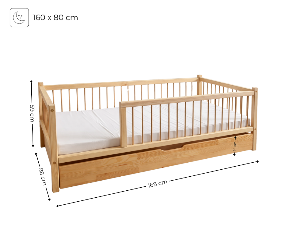 Wykonane w całości z naturalnego drewna sosnowego, łóżko drewniane Krzyś wyróżnia się solidnością oraz estetycznym wykończeniem. Konstrukcja została dopracowana w każdym detalu, a gładkie powierzchnie i zaokrąglone krawędzie zwiększają bezpieczeństwo użytkowania. Barierka ochronna z pionowymi szczebelkami zabezpiecza dziecko podczas snu, jednocześnie nadając łóżku lekkości wizualnej. W zestawie znajduje się stelaż pod materac oraz podstawowy materac piankowy, dzięki czemu łóżko jest gotowe do użytkowania od razu po złożeniu.
