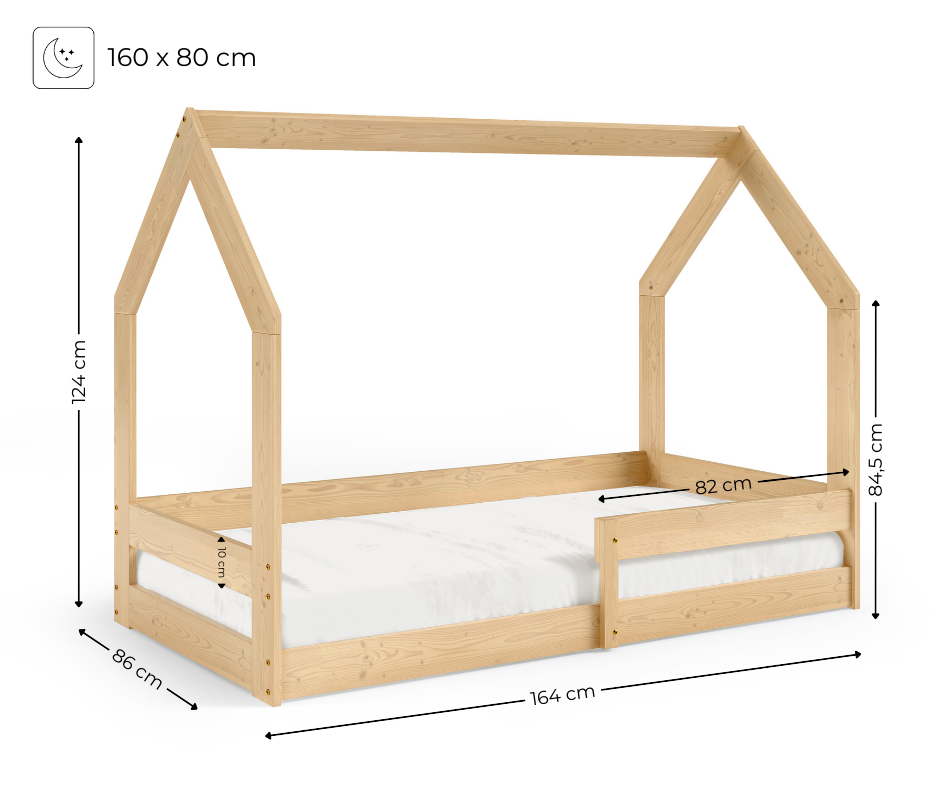 Bez wątpienia łóżko drewniane Czaruś to idealna propozycja dla dzieci, które wyrosły już z niemowlęcej kołyski i potrzebują własnego, przytulnego miejsca do spania oraz zabawy. Dzięki formie przypominającej domek, łóżko wprowadza do wnętrza dziecięcego pokoju nie tylko ciekawy element dekoracyjny, ale przede wszystkim tworzy radosną i ciepłą atmosferę, sprzyjającą zarówno relaksowi, jak i codziennej zabawie. Co ważne, konstrukcja została wykonana z naturalnego drewna sosnowego, które malowane jest trzykrotnie bezpieczną, bezwonną farbą wodną. Wszystko po to, aby zagwarantować Twojemu dziecku pełne bezpieczeństwo i komfort.
