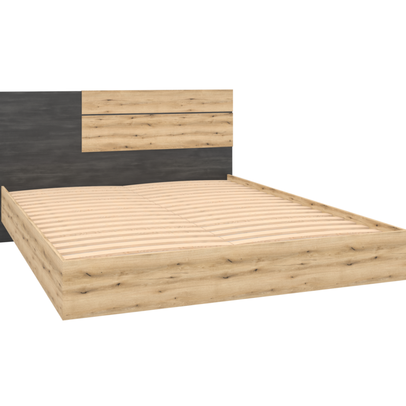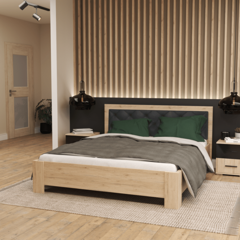 • Stelaż łóżka: Konstrukcja została wykonana z połączenia płyty wiórowej oraz drewna sosnowego, co zapewnia stabilność i trwałość przez długie lata użytkowania.