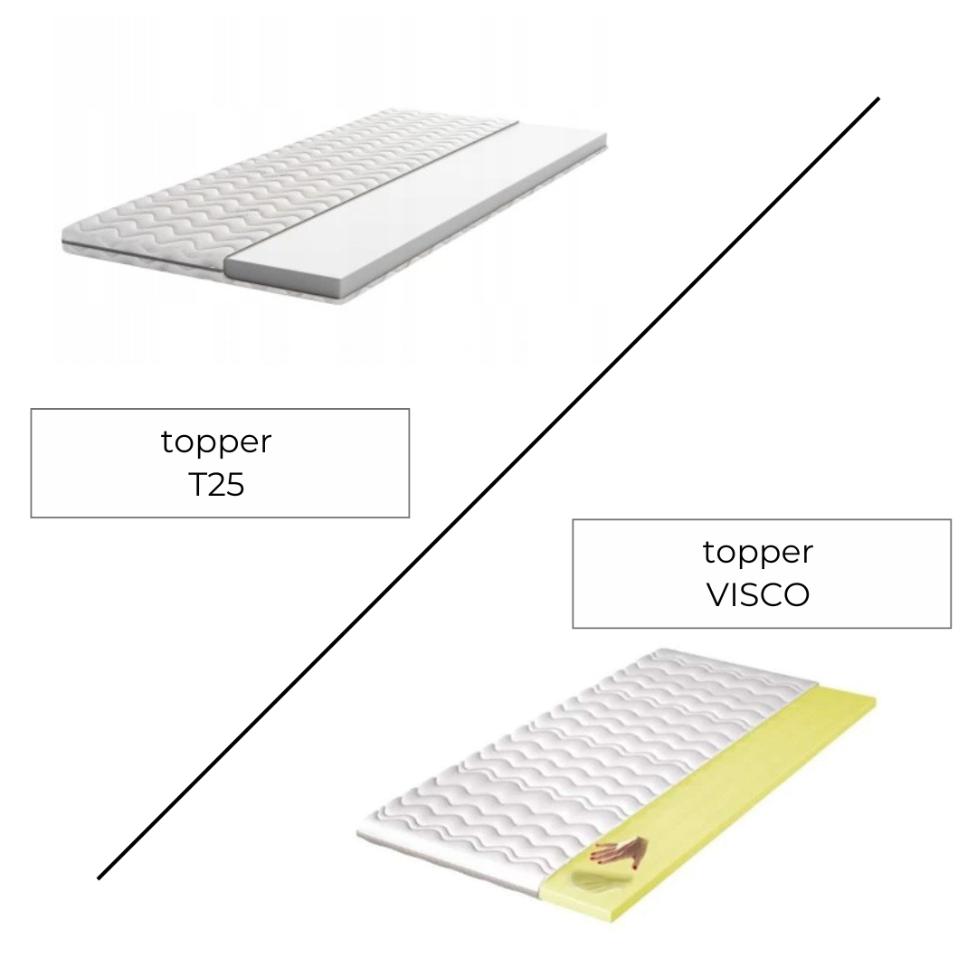 Zarówno pianka T25, jak i pianka Visco dopasowują się do sylwetki, odciążając kręgosłup i redukując punkty nacisku. Dodatkowo topper chroni główny materac przed zabrudzeniem i wilgocią, co znacząco poprawia higienę snu. Dzięki łatwej pielęgnacji oraz możliwości regularnego prania pokrowca, zachowasz świeżość i trwałość materaca na dłużej. Topper doskonale wyrównuje powierzchnię spania, co jest szczególnie przydatne, jeśli główny materac okaże się zbyt twardy lub nierówny.