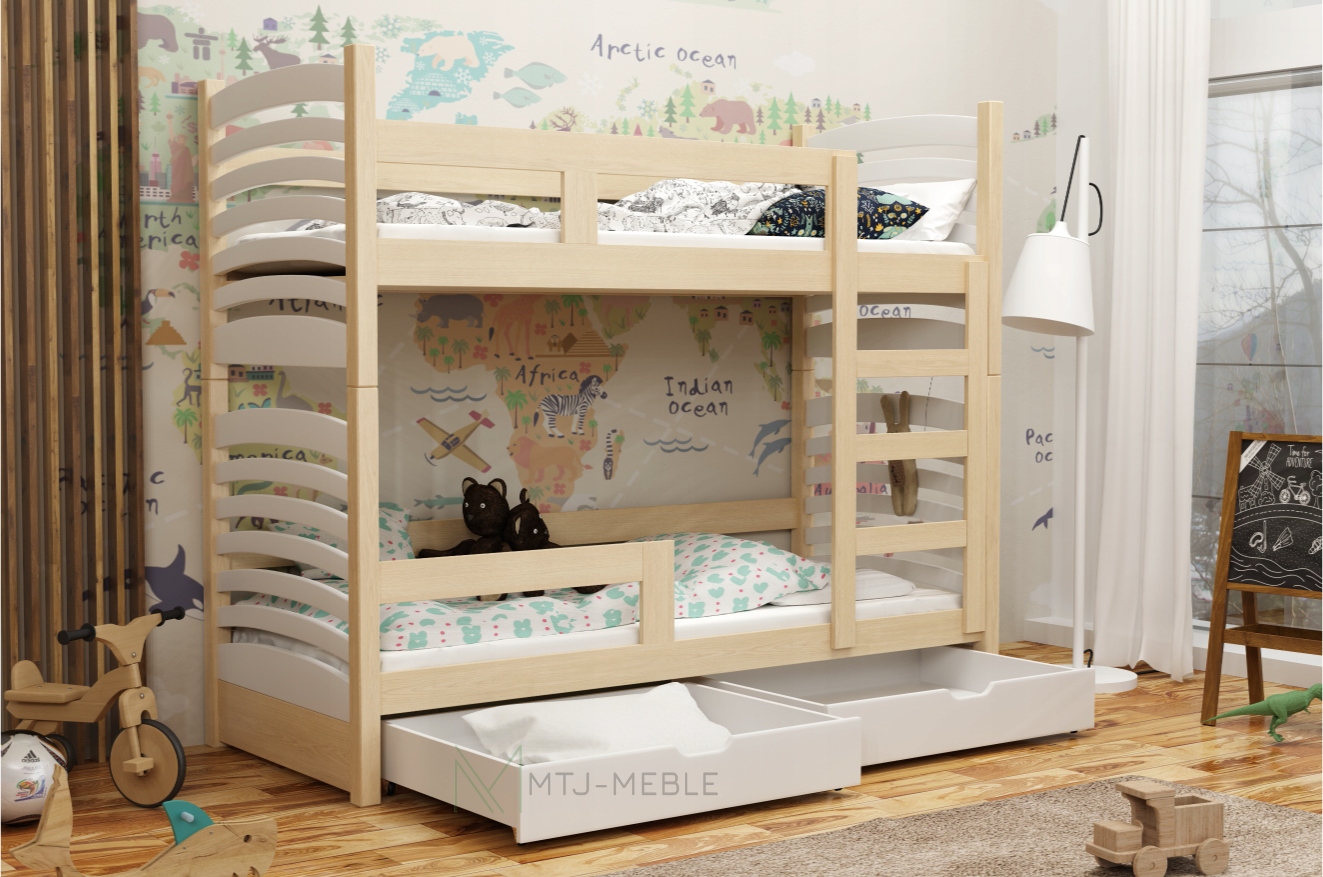 Wybierając łóżko piętrowe Olek 2 szczebelki, inwestujesz w mebel wykonany z trwałego i bezpiecznego drewna sosnowego. Dodatkowo łóżko pokryliśmy ekologicznymi farbami wodnymi posiadającymi odpowiednie certyfikaty. To zapewnia, że łóżko nie tylko wygląda estetycznie, ale również spełnia najwyższe normy bezpieczeństwa. W zestawie znajdują się dwa piankowe materace z pokrowcami na zamek. Dzięki temu łatwiej zadbasz o higienę i świeżość w pokoju dziecka. Dodatkowo model ten wyposażony jest w dwie pojemne szuflady, które doskonale sprawdzą się do przechowywania pościeli, ubrań lub zabawek.