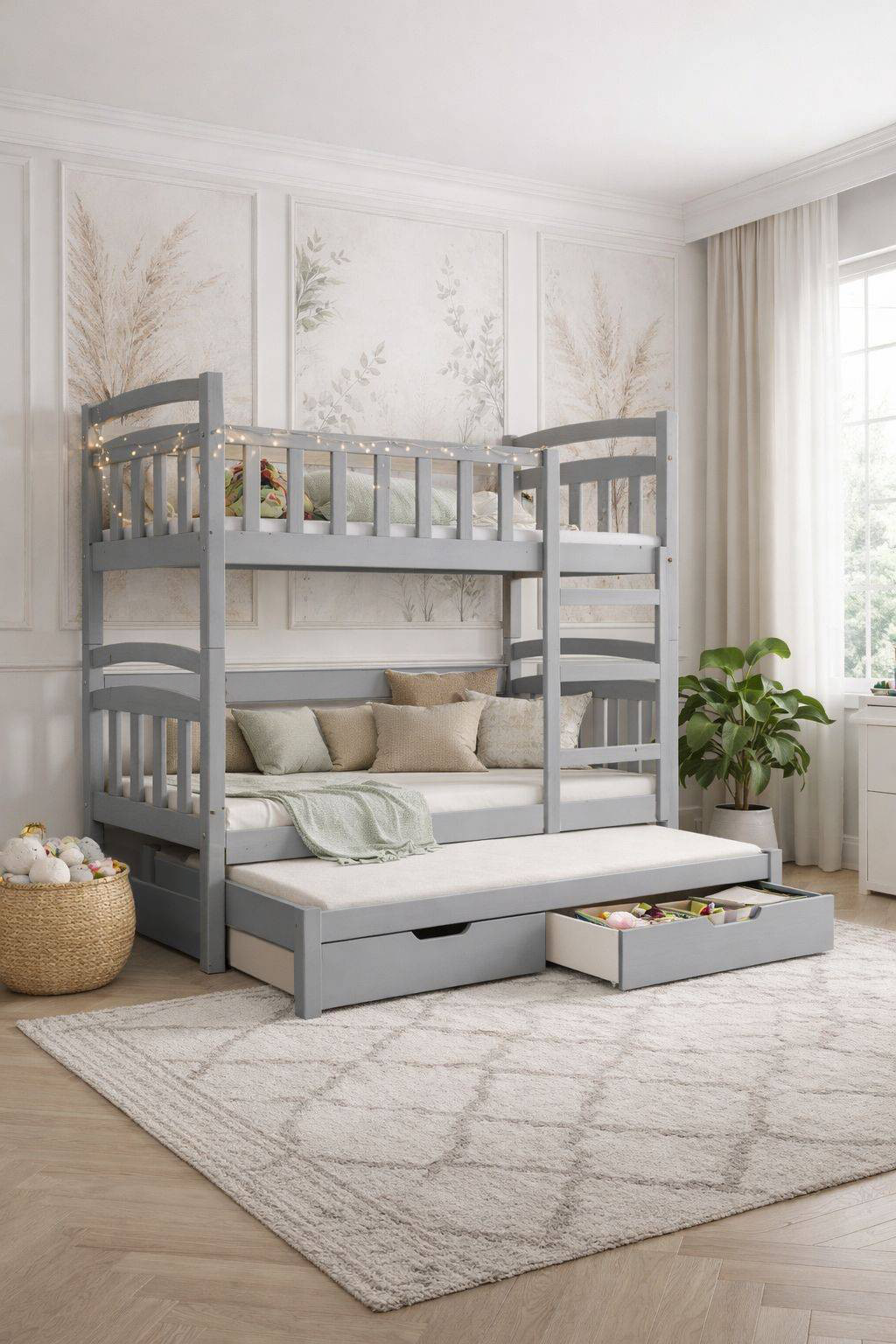 Stabilna konstrukcja z drewna sosnowego zapewnia nie tylko trwałość, ale również odporność na codzienne użytkowanie przez dzieci. Dodatkowo każdy element został zabezpieczony bezpiecznym lakierem wodnym, a wszystkie krawędzie są starannie zaokrąglone, by zwiększyć poziom bezpieczeństwa. Barierki ochronne oraz solidna drabinka dają pewność, że maluchy mogą spać spokojnie, bez ryzyka upadku. W zestawie znajdziesz także trzy wygodne materace piankowe z pokrowcami na zamek błyskawiczny, co ułatwia ich utrzymanie w czystości. Dodatkowo pojemne szuflady pod dolnym łóżkiem to dodatkowy atut – idealne na pościel, zabawki czy sezonowe ubrania.