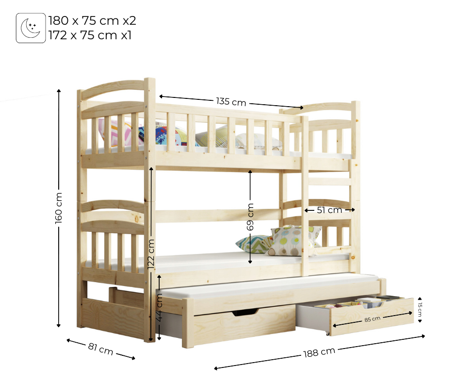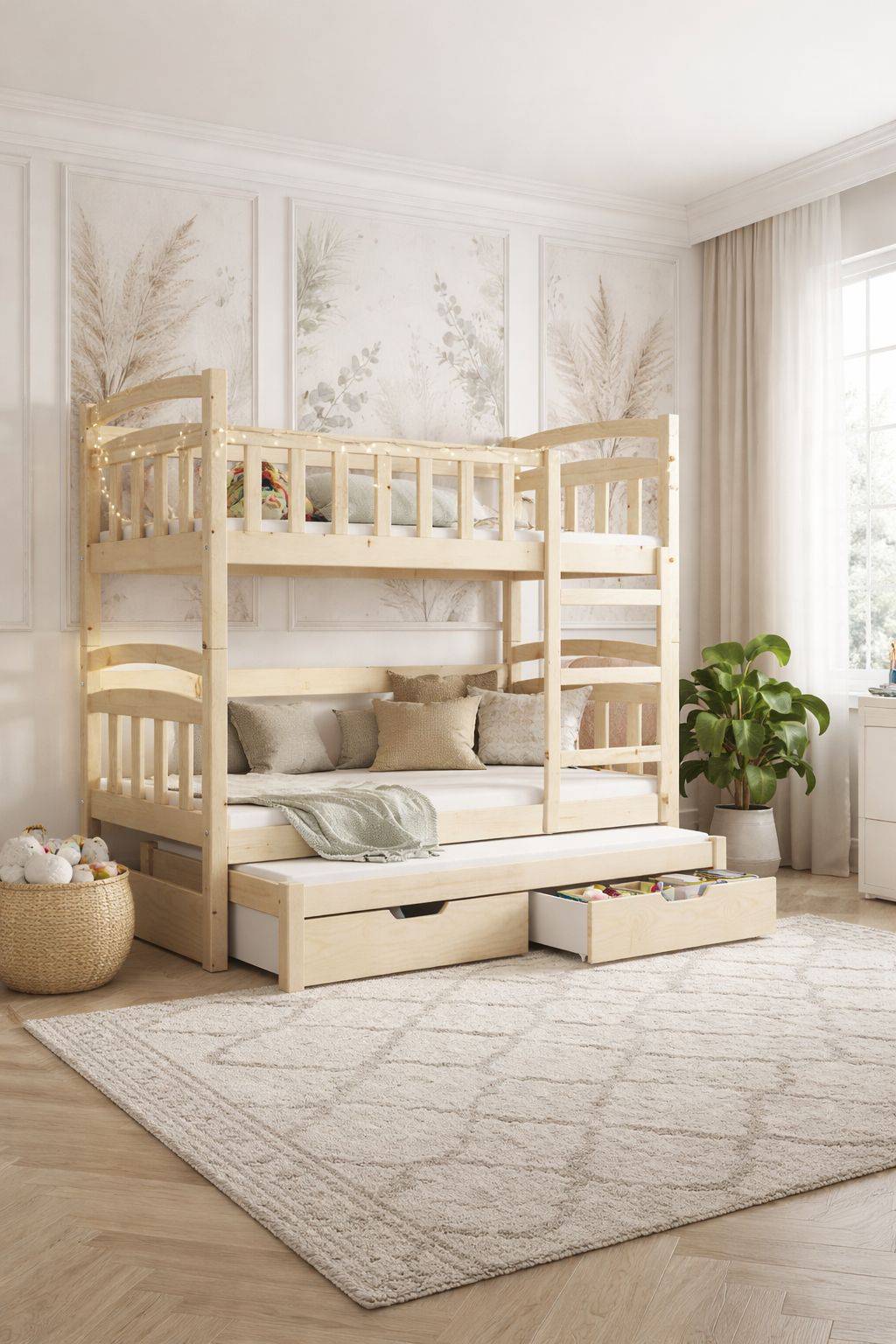 Niewątpliwie łóżko piętrowe Dawid to wyjątkowa propozycja dla rodzin, które chcą w pełni wykorzystać dostępną przestrzeń, nie rezygnując przy tym z wygody, stylu i dziecięcej radości. Piętrowa konstrukcja nie tylko pomieści aż trzech małych śpiochów, ale również zamieni zwykły pokój w centrum kreatywnej zabawy. W ciągu dnia łóżko może służyć jako domek, baza, wieża albo zamek – wszystko zależy od wyobraźni dziecka. Dzięki starannie przemyślanej formie, mebel nie zajmuje wiele miejsca, a jednocześnie staje się efektownym i praktycznym elementem dziecięcego wnętrza. Dodatkowo stabilna drabinka i ochronne barierki zapewniają pełne bezpieczeństwo nawet najmłodszym użytkownikom.