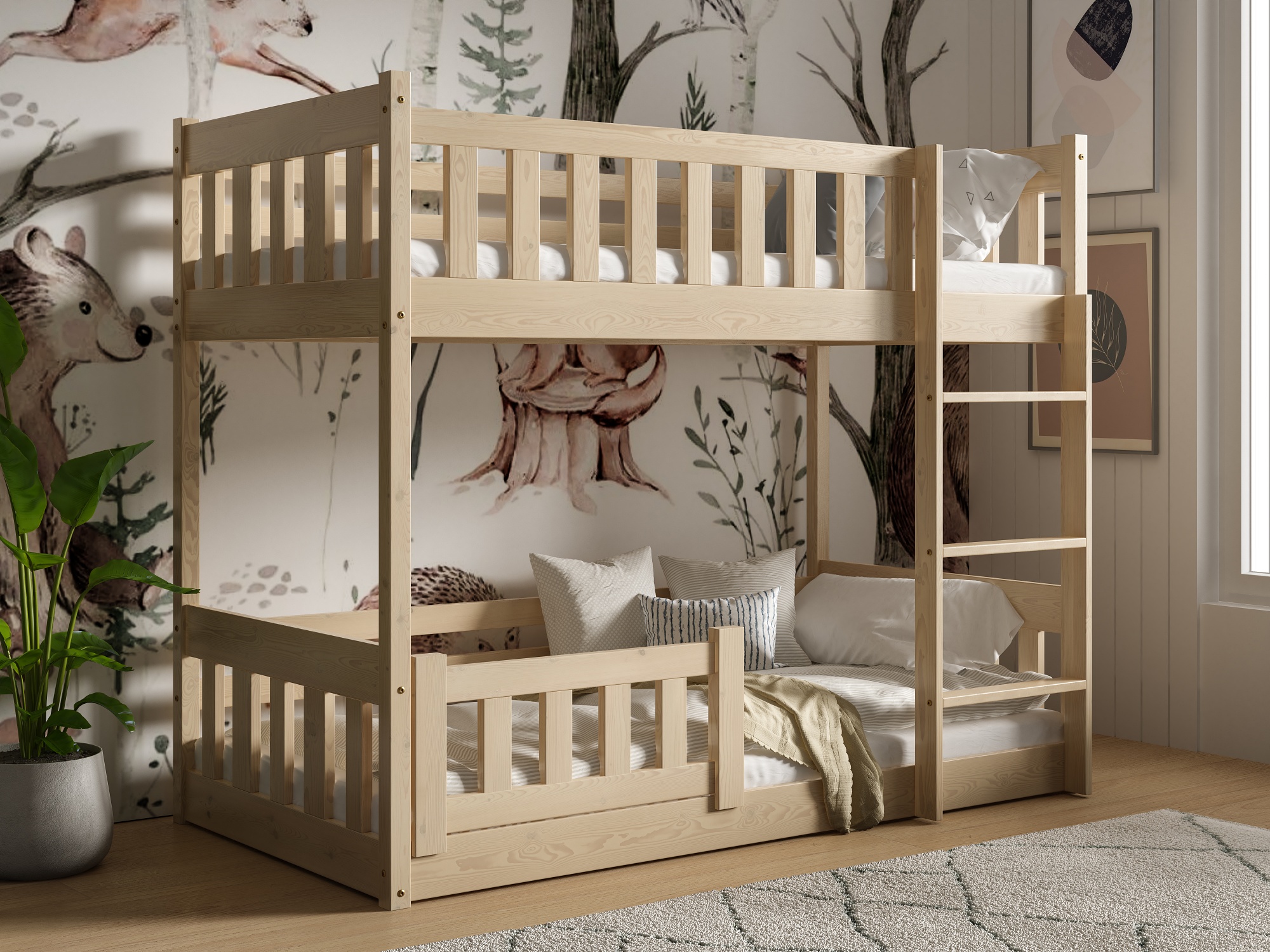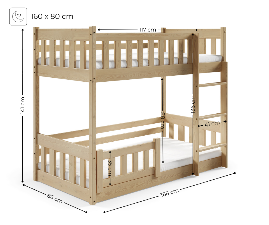 Każdy element łóżka został zaprojektowany z myślą o dzieciach – solidna drabinka z szerokimi stopniami i poręczami, a także barierki ochronne, które minimalizują ryzyko upadku podczas snu. To sprawia, że łóżko może być użytkowane już od pierwszego roku życia dziecka. Dodatkowo, materace piankowe dołączone do zestawu zapewniają zdrowe podparcie dla kręgosłupa i wysoki komfort odpoczynku. Co więcej, trzy warstwy lakieru użytego do zabezpieczenia powierzchni są w pełni bezpieczne dla dzieci i nie wydzielają szkodliwych substancji.