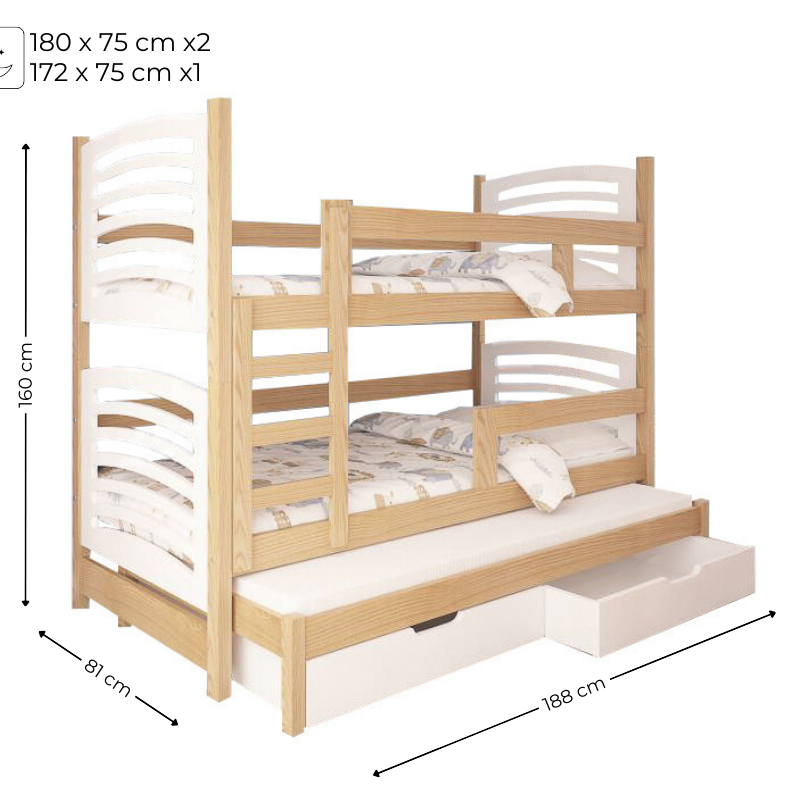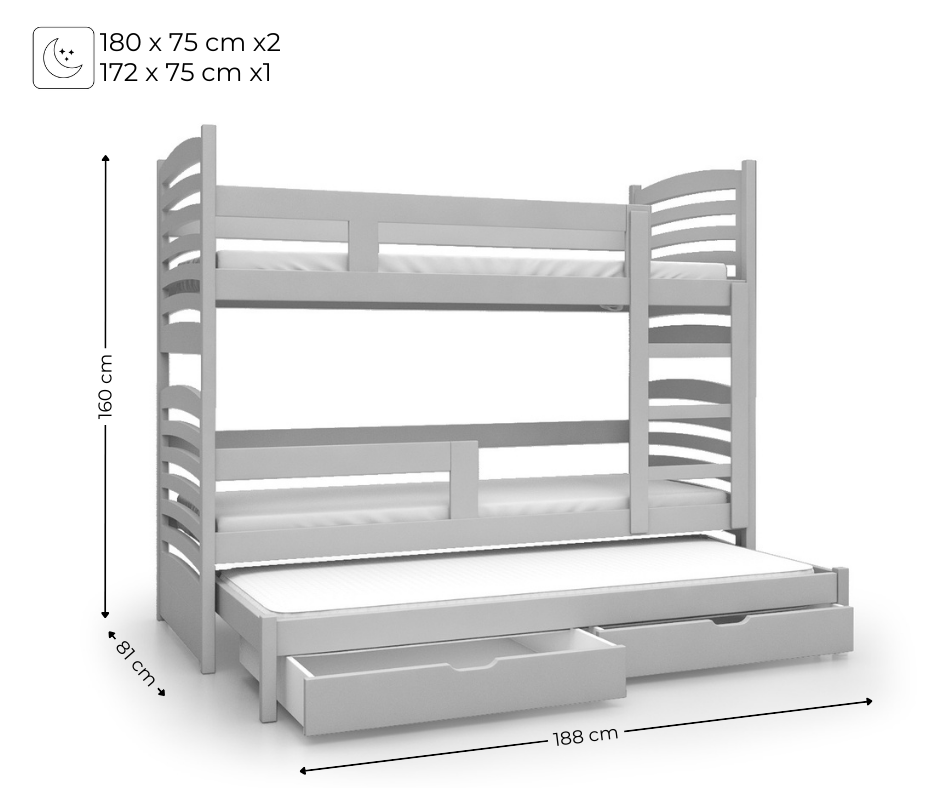 W zestawie otrzymujesz aż trzy wygodne materace piankowe, każdy z pokrowcem zapinanym na zamek, co ułatwia ich zdejmowanie i pranie. Dodatkowo wysuwana dolna część łóżka pełni funkcję trzeciego spania, a pod nią znajdują się dwie pojemne szuflady wykonane z płyty wiórowej. Dzięki nim z łatwością przechowasz pościel, zabawki czy inne dziecięce skarby, utrzymując porządek bez potrzeby dodatkowych mebli. Co więcej, łóżko Olek umożliwia pełne wykorzystanie przestrzeni w pokoju dziecięcym. Czyni je to doskonałym wyborem zarówno dla większych rodzin, jak i dla tych, które często goszczą małych przyjaciół swoich pociech.