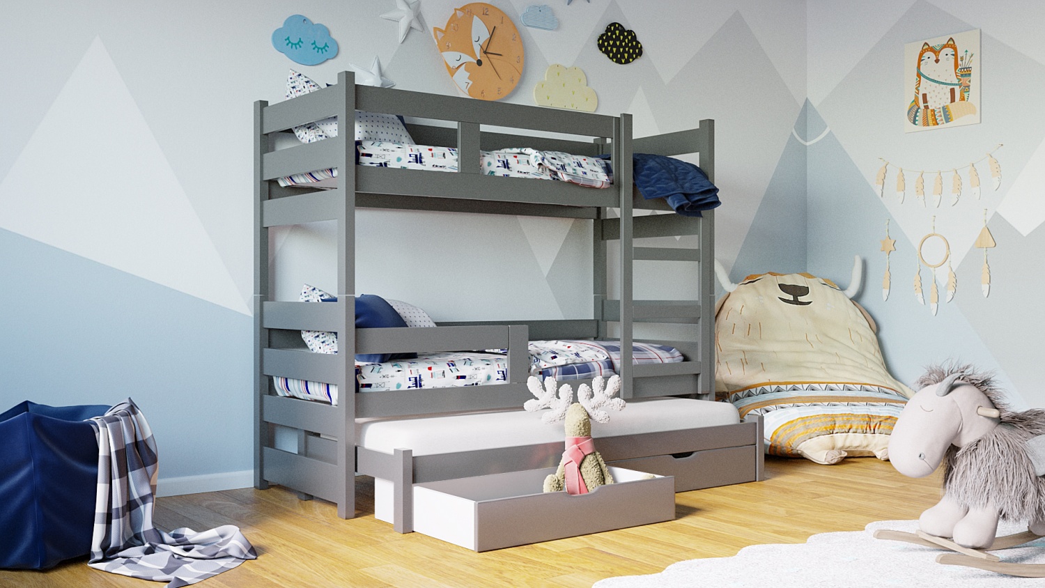 W zestawie z łóżkiem znajdują się trzy materace piankowe z pokrowcami zapinanymi na zamek. Można je z łatwością zdjąć do prania, co znacznie ułatwia utrzymanie czystości. Dodatkowo dołączone zostały także stelaże pod każdy z materacy, dzięki czemu łóżko jest gotowe do użytkowania zaraz po złożeniu. Dwie pojemne szuflady na dole konstrukcji mogą posłużyć jako praktyczne schowki na pościel, zabawki lub inne akcesoria dziecięce, co pozwala zaoszczędzić miejsce w pokoju i utrzymać porządek.</strong>