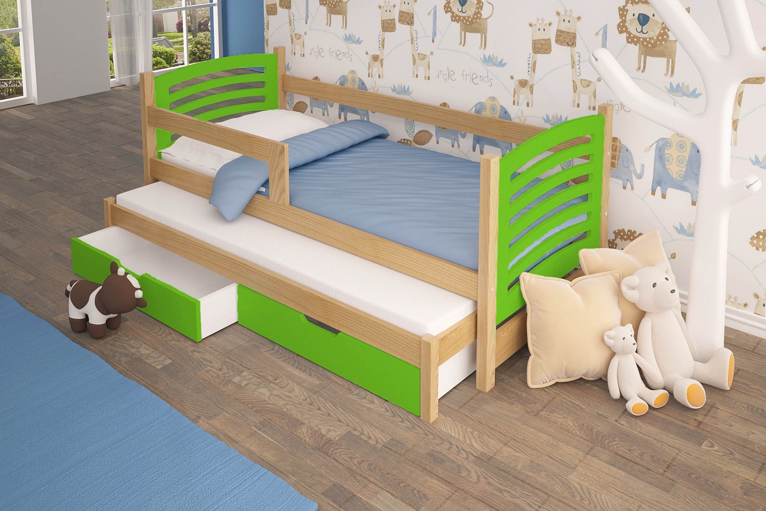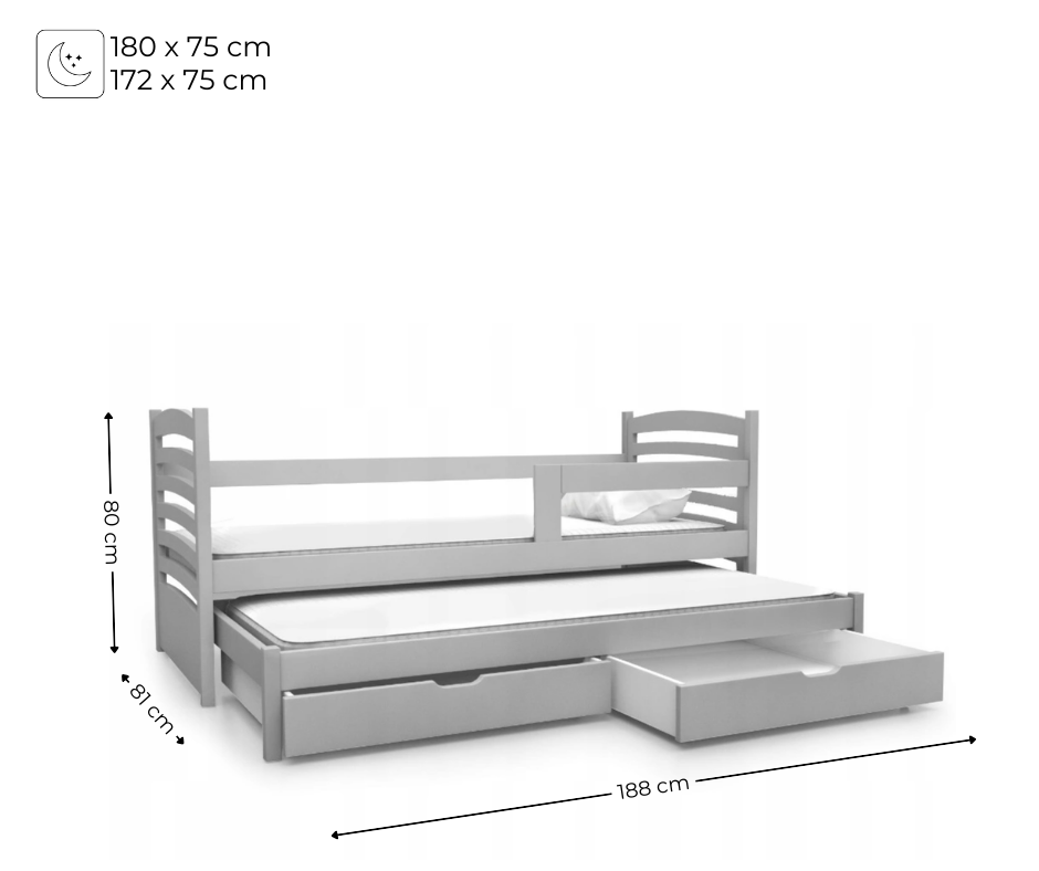 Warto zaznaczyć, że model Olek wyposażony został w wysuwaną dolną część, która pełni funkcję drugiego spania. Co więcej, pod wysuwaną częścią znajdują się dwie funkcjonalne szuflady – idealne na pościel, zabawki lub ubrania. Dzięki temu łóżko pozwala zaoszczędzić miejsce i jednocześnie utrzymać porządek w dziecięcym pokoju. W zestawie znajdują się również dwa wygodne materace piankowe z pokrowcami, które można łatwo zdjąć do prania. Dodatkowo także solidne stelaże pod materace, co czyni cały zestaw kompletnym i gotowym do użytku.