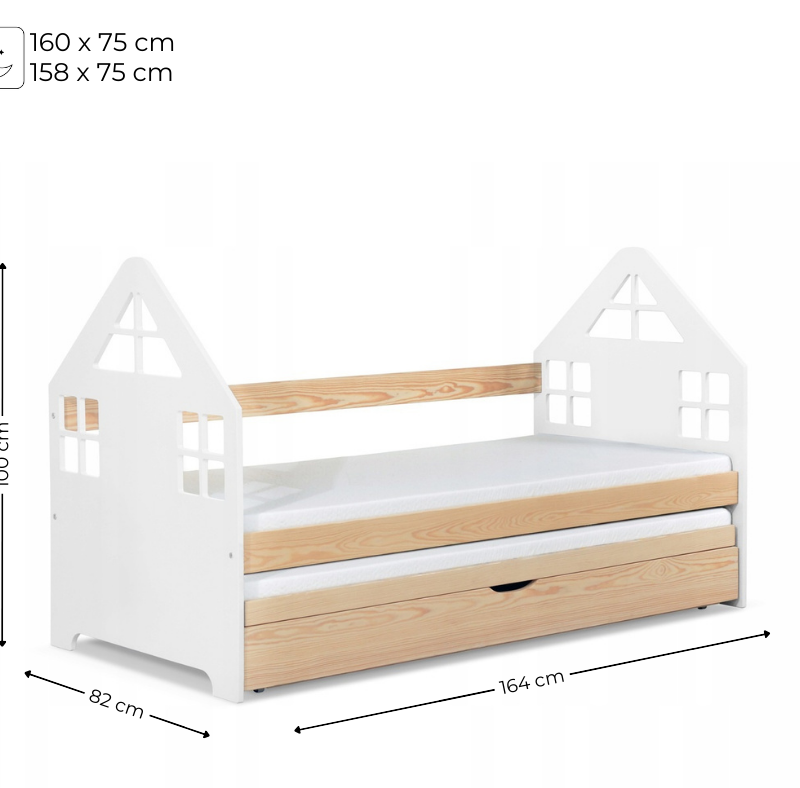 Nie bez znaczenia pozostaje również fakt, że łóżko zostało wykonane z naturalnego drewna sosnowego, malowanego ekologicznymi farbami wodnymi posiadającymi certyfikat bezpieczeństwa. Dodatkowo dzięki temu zyskujesz gwarancję trwałości oraz komfort użytkowania przez wiele lat. Przede wszystkim w zestawie znajdują się dwa wygodne materace piankowe z pokrowcami, które można łatwo wypiąć i wyprać, co znacznie ułatwia utrzymanie higieny.