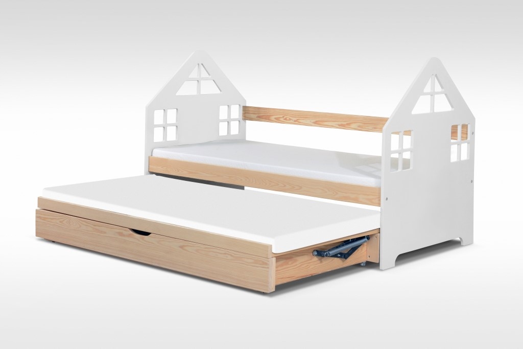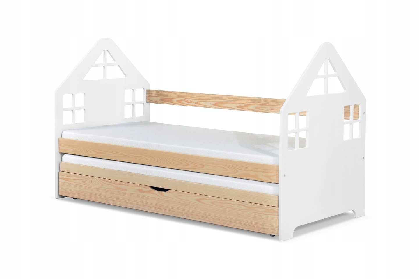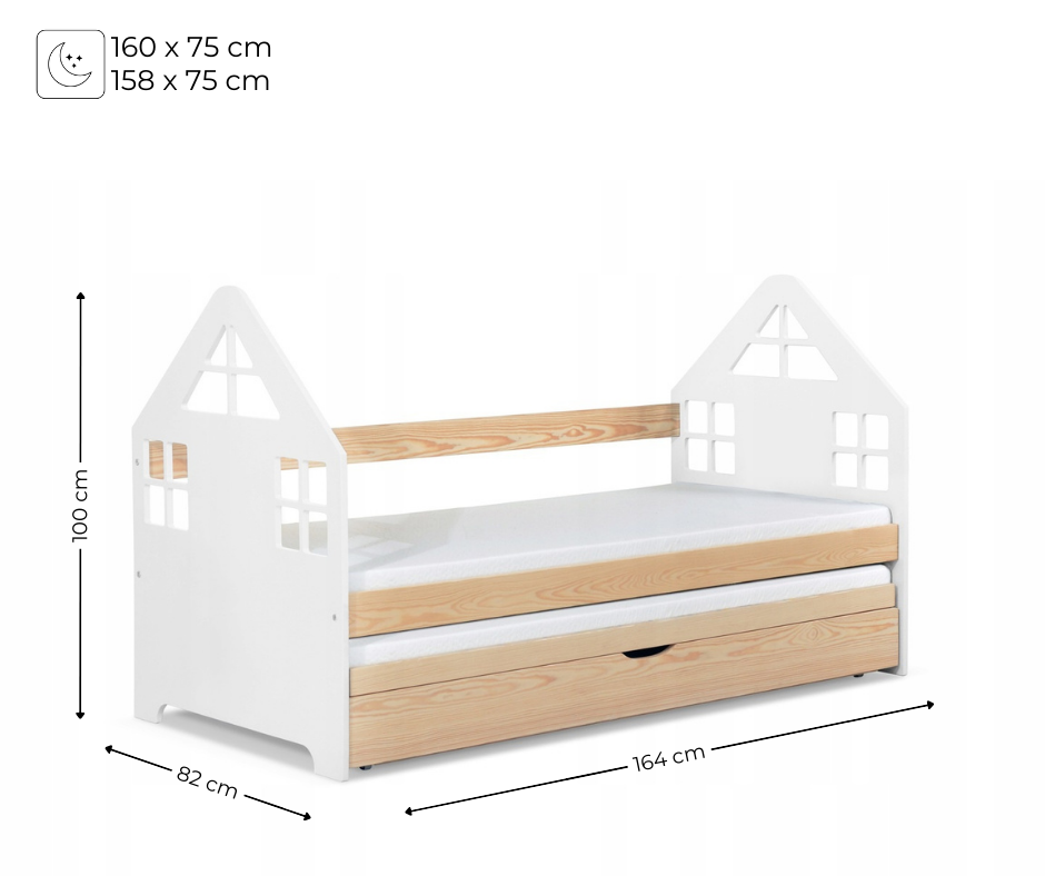 Bez wątpienia łóżko podwójne Domek to wyjątkowe połączenie praktyczności, estetyki i dziecięcej wyobraźni. Dlatego już od pierwszych chwil zwraca uwagę swoją bryłą w kształcie domku. Dodatkowo stwarza to przytulną atmosferę i zamienia zwykłe łóżko w magiczne miejsce do snu i zabawy. Co więcej, model ten został zaprojektowaliśmy z myślą o rodzeństwach i małych przestrzeniach. Istotne jest, iż dzięki dodatkowemu, wysuwanemu miejscu do spania zyskujesz dwa wygodne łóżka w jednej kompaktowej konstrukcji. Ponadto łóżko wyposażyliśmy je w pojemną szufladę, idealną do przechowywania pościeli, zabawek czy dziecięcych skarbów.