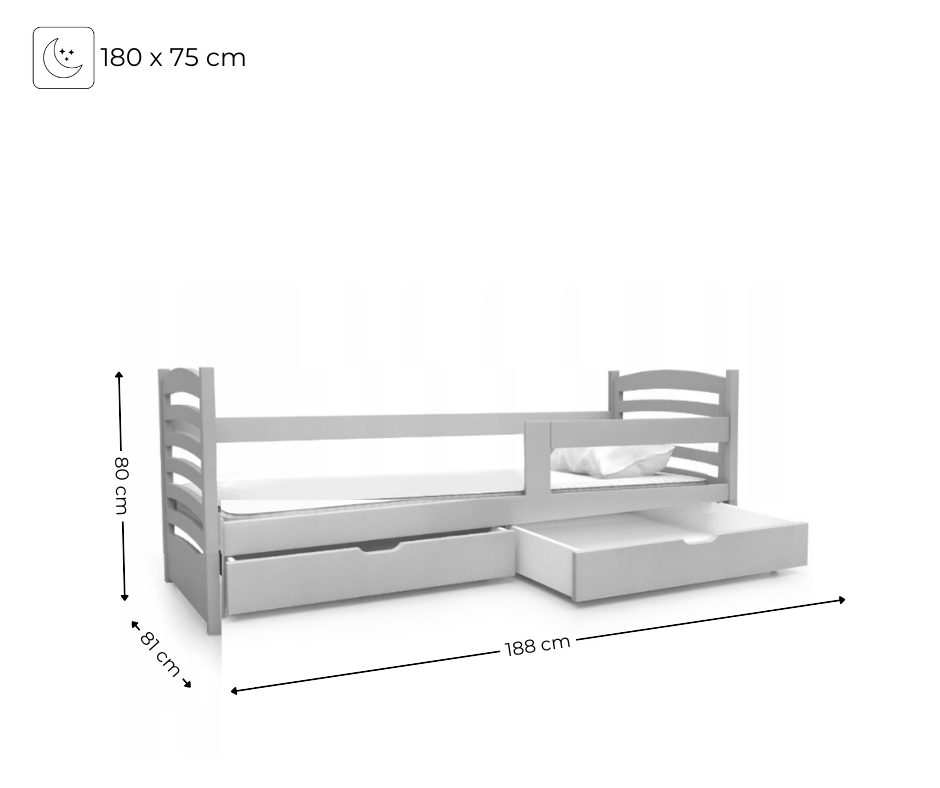 Dzięki zastosowaniu przemyślanej konstrukcji, łóżko oferuje komfortowy sen i pełne wsparcie dla rozwijającego się kręgosłupa. W zestawie znajduje się także materac piankowy z możliwością wypinania poszewki, a także solidny stelaż pod materac, co oznacza, że mebel jest gotowy do użytku od razu po złożeniu. Dodatkowo łóżko wyposażone zostało w dwie praktyczne szuflady, które pomogą w organizacji przestrzeni i przechowywaniu pościeli, zabawek lub dziecięcych ubrań.