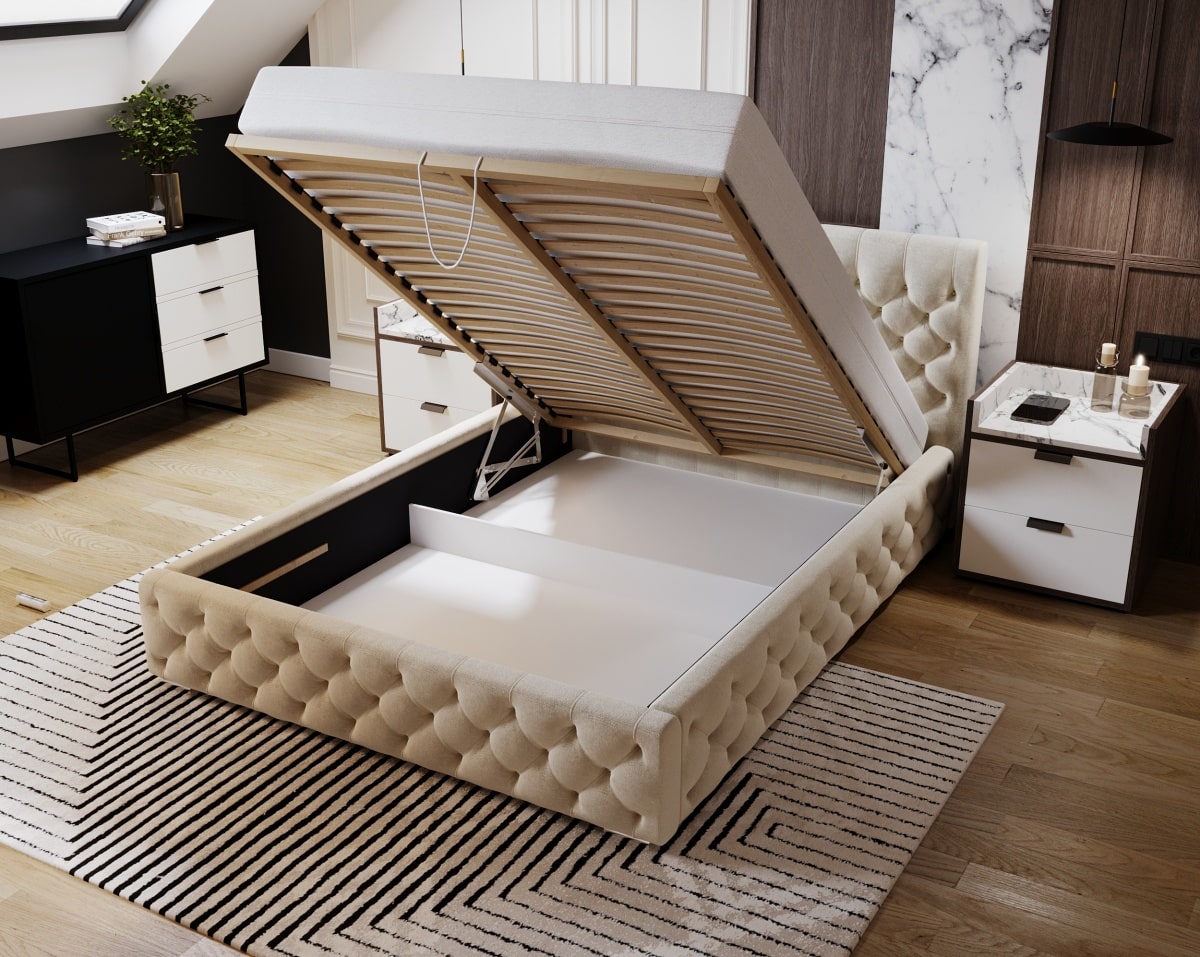 Dzięki dostępności w różnych rozmiarach – od 140×200 do 200×200 cm – Łóżko tapicerowane Chesterfield z powodzeniem sprawdzi się zarówno w przestronnej, jak i mniejszej sypialni. Dodatkowo, wbudowany pojemnik na pościel pomoże Ci wygodnie zorganizować przestrzeń, a solidna konstrukcja zapewni stabilność i komfort snu. Co więcej, estetyka łóżka pozwala na łatwe łączenie go z klasycznymi dodatkami oraz nowoczesnymi aranżacjami.