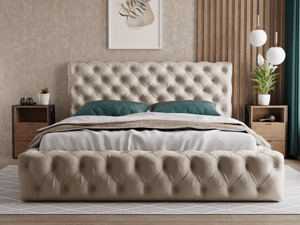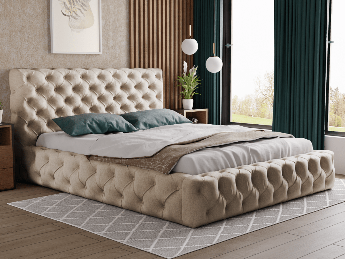 Flora to łóżko tapicerowane miękką tkaniną pluszową w intensywnym kolorze, który ożywi wystrój Twojej sypialni, nadając jej szyku i stylowego wyglądu. Trwała konstrukcja z płyty meblowej i drewna składa się z podstawy, w której umieszczono pojemny schowek na pościel czy inne tekstylia. Na skrzyni znajduje się solidny, drewniany stelaż wyposażony w podnośniki sprężynowe, które ułatwią Ci dostanie się do pojemnika. Bryła oparta jest na niskich, drewnianych nóżkach w kolorze wenge i posiada gustowne pikowanie, co stanowi piękne wykończenie całości.