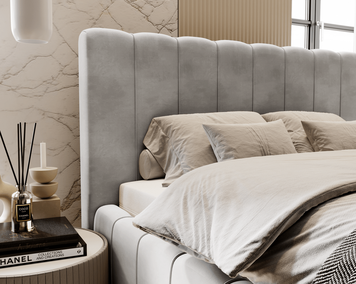 - Wezgłowie zdobione przeszyciami, wykonane z wysokiej jakości pianki, co zapewnia nie tylko estetyczny wygląd, ale także komfort podczas użytkowania.