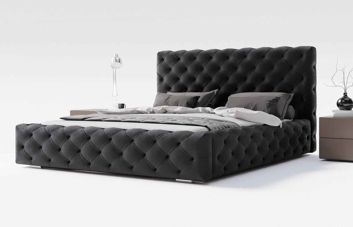 Vito to łóżko obite miłą w dotyku tkaniną pluszową o intensywnej barwie, która ożywi wystrój Twojej sypialni. Solidna konstrukcja z płyty meblowej i drewna składa się ze skrzyni, w której znajduje się obszerny pojemnik na pościel czy inne tekstylia – dzięki temu zaoszczędzisz mnóstwo miejsca do przechowywania. Na podstawie łóżka umieszczono drewniany stelaż wyposażony w podnośniki sprężynowe, które ułatwią Ci dostanie się do schowka. Bryłę korpusu ozdobiono gustownym pikowaniem, które nadaje całości elegancji i oryginalnego wykończenia. Vito fantastycznie sprawdzi się we wnętrzach w klimacie glamour podkreślając ich wyrafinowanie, a także w bardziej stonowanych i skromnych aranżacjach, gdzie będzie głównym punktem skupiającym wzrok.