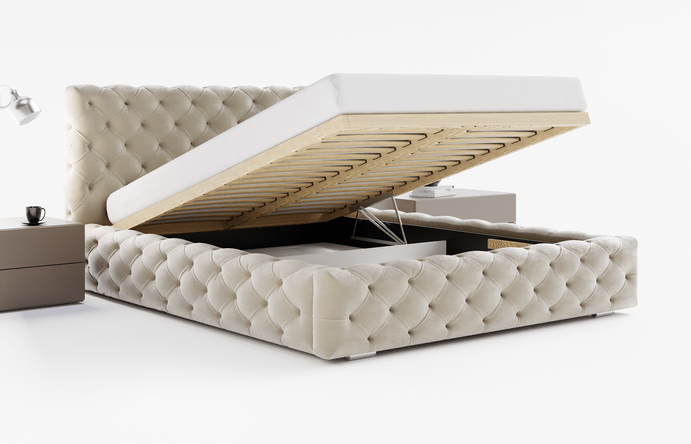 - łóżko wyposażono w duży, praktyczny pojemnik na pościel,