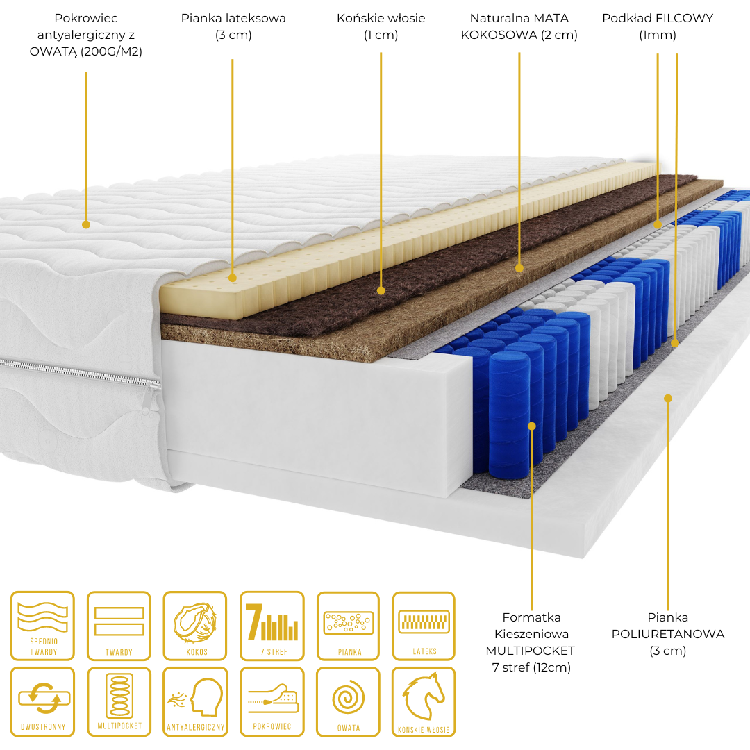 - Wkład materaca stanowią pracujące niezależnie sprężyny Multipocket posiadające 7 stref komfortu