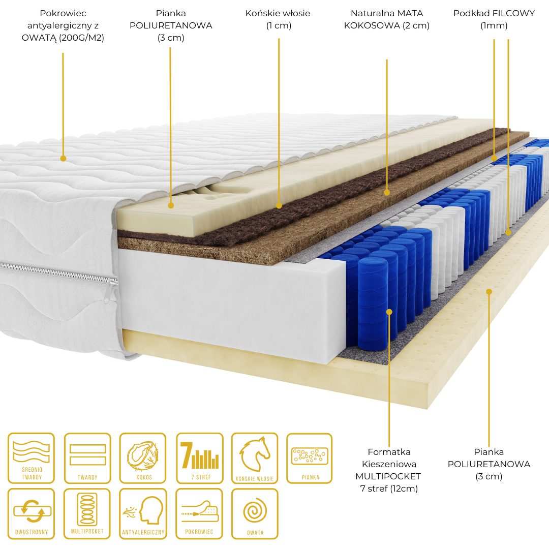 - Mata kokosowa pochodzenia roślinnego poprawia cyrkulację powietrza i wpływa dodatnio na higienę snu. Jej zadaniem jest także zwiększenie twardości materaca.