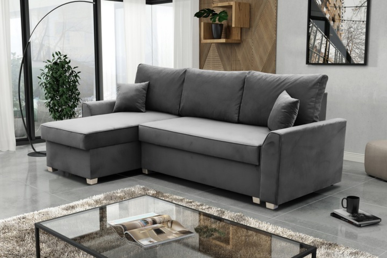 Dzięki aksamitnej tkaninie o miękkiej strukturze, narożnik Aurora velvet nie tylko przyciąga wzrok, ale też zapewnia wyjątkowe doznania dotykowe. Dodatkowo, jego miękkie poduszki i chromowane nogi tworzą harmonijną całość, która wpisuje się w nowoczesny styl modern classic. Co ważne, narożnik został wyposażony w funkcję spania, dlatego w razie potrzeby w kilka chwil zamienisz go w wygodne łóżko. Praktyczny pojemnik na pościel pozwala natomiast uporządkować wnętrze i zaoszczędzić miejsce.