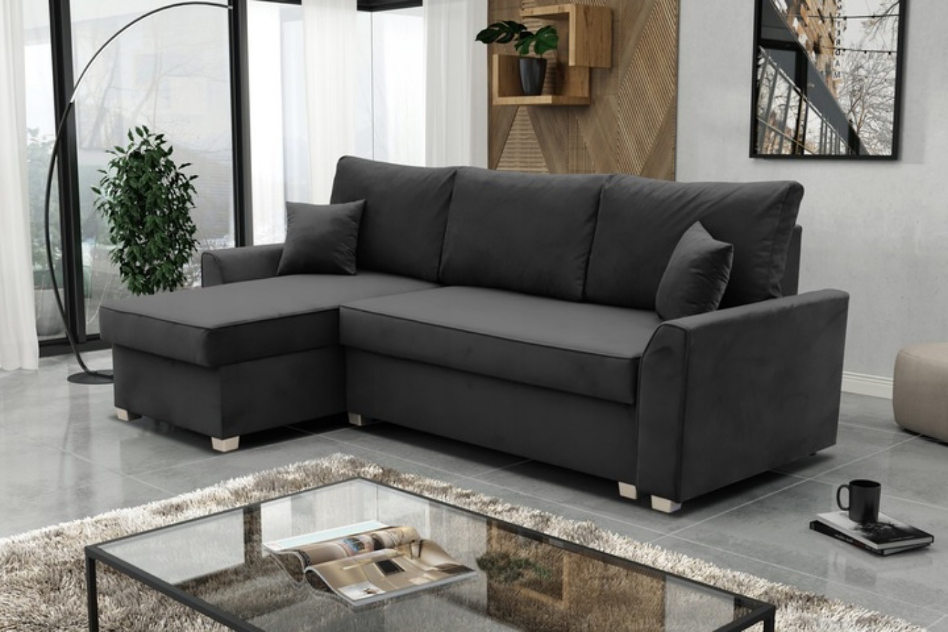 Dzięki aksamitnej tkaninie o miękkiej strukturze, narożnik Aurora velvet nie tylko przyciąga wzrok, ale też zapewnia wyjątkowe doznania dotykowe. Dodatkowo, jego miękkie poduszki i chromowane nogi tworzą harmonijną całość, która wpisuje się w nowoczesny styl modern classic. Co ważne, narożnik został wyposażony w funkcję spania, dlatego w razie potrzeby w kilka chwil zamienisz go w wygodne łóżko. Praktyczny pojemnik na pościel pozwala natomiast uporządkować wnętrze i zaoszczędzić miejsce.