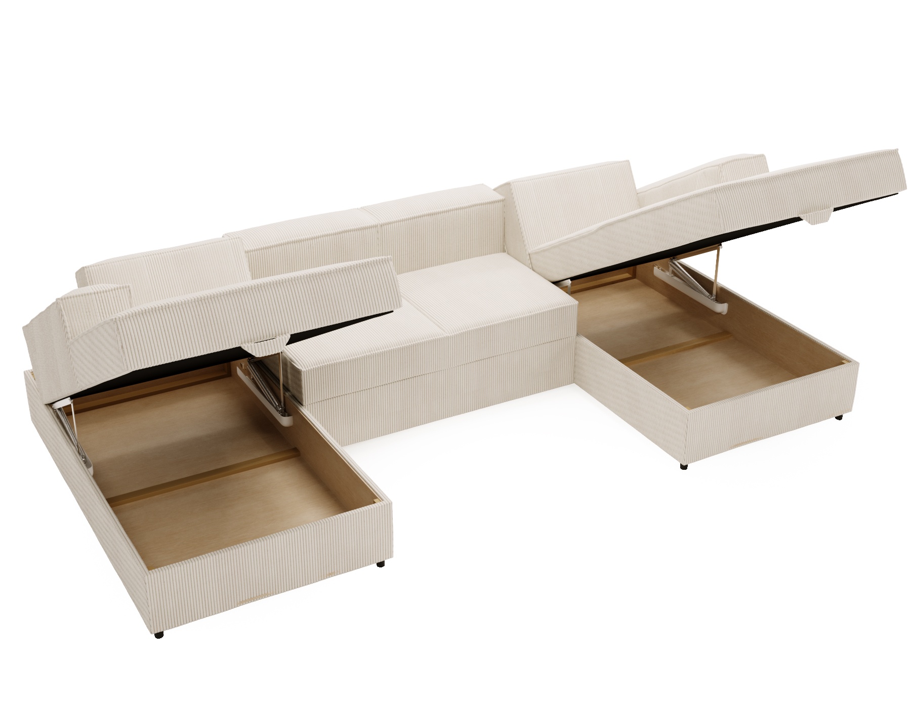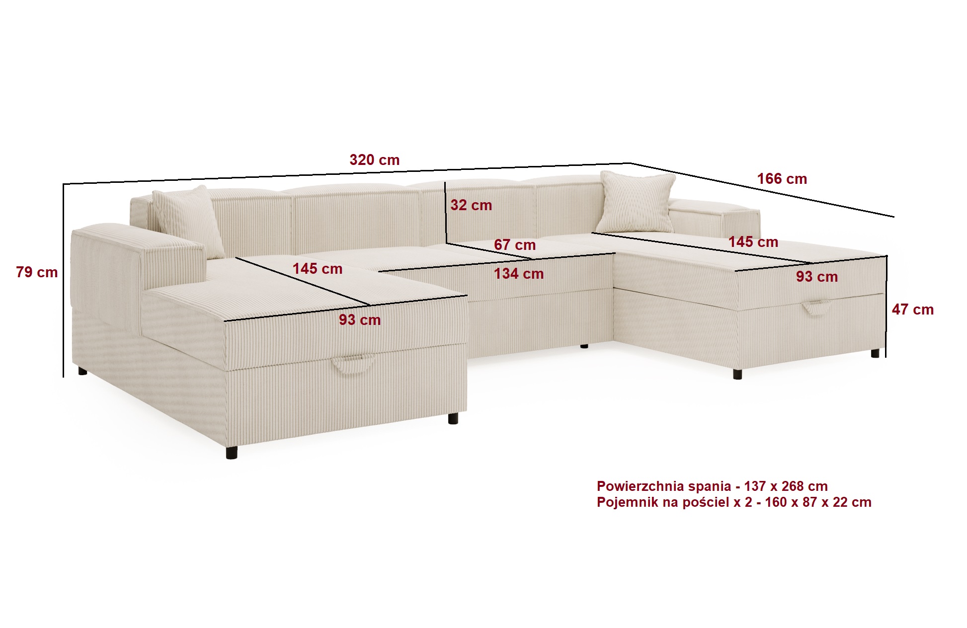 Wysokiej jakości pianka i sprężyny faliste gwarantują komfort podczas siedzenia oraz snu, dlatego narożnik z funkcją spania PASCAL U idealnie sprawdza się w roli mebla wielozadaniowego. Co istotne, narożnik posiada aż dwa pojemniki na pościel, które ułatwiają przechowywanie tekstyliów i utrzymanie porządku w salonie. Dodatkowo dekoracyjne poduszki z silikonowym wypełnieniem podnoszą walory estetyczne, a tył mebla został tapicerowany tkaniną, co pozwala na jego swobodne ustawienie w dowolnym miejscu – nawet na środku pomieszczenia.