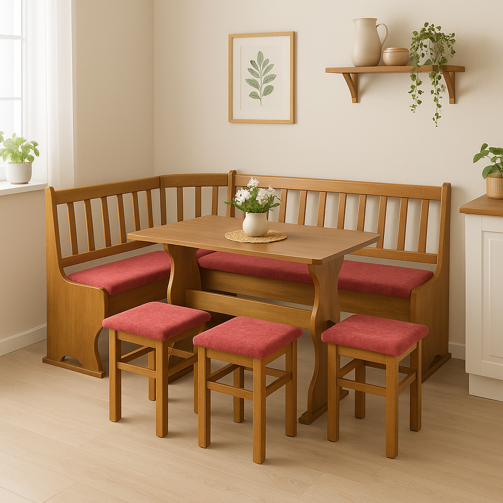 Zaufaj nam! Narożnik kuchenny N14 to doskonały sposób na organizację kącika jadalnego i przy okazji ekonomiczne zagospodarowanie kuchennej przestrzeni. Wkomponowany w róg pomieszczenia nie wymaga zachowania wolnego miejsca na odsuwanie, jak to ma miejsce w przypadku krzeseł. Jest też bardzo komfortowy i pojemny zapewniając wygodne siedzenie kilku osobom. To idealny mebel dla rodzin, w których są małe dzieci. Usytuowanie zapobiega kręceniu się i wstawaniu od stołu bez potrzeby, a także eliminuje ryzyko przewrócenia się czy spadnięcia. Dzięki pięknemu wykończeniu narożnik może też być ustawiony z dala od ściany.