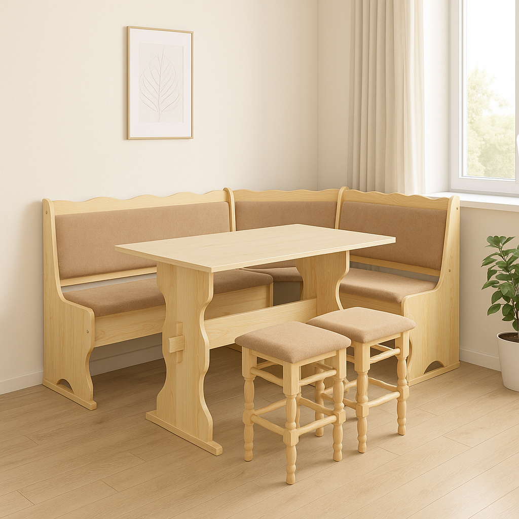Zaufaj nam! Narożnik kuchenny N2 to doskonały sposób na organizację kącika jadalnego i przy okazji ekonomiczne zagospodarowanie kuchennej przestrzeni. Wkomponowany w róg pomieszczenia nie wymaga zachowania wolnego miejsca na odsuwanie, jak to ma miejsce w przypadku krzeseł. Jest też bardzo komfortowy i pojemny zapewniając wygodne siedzenie kilku osobom. To idealny mebel dla rodzin, w których są małe dzieci. Usytuowanie zapobiega kręceniu się i wstawaniu od stołu bez potrzeby, a także eliminuje ryzyko przewrócenia się czy spadnięcia. Dzięki pięknemu wykończeniu narożnik może też być ustawiony z dala od ściany.