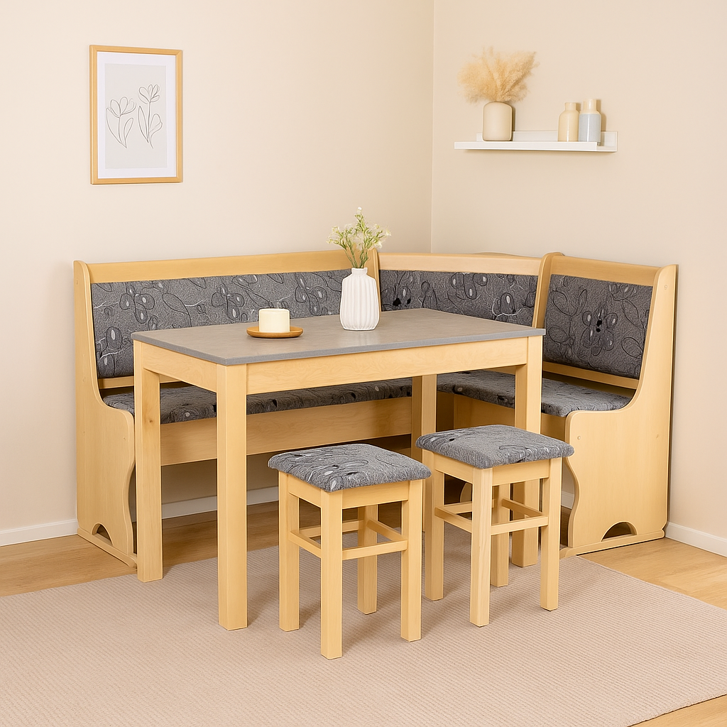 Zaufaj mi! Narożnik kuchenny N5 to doskonały sposób na organizację kącika jadalnego i przy okazji ekonomiczne zagospodarowanie kuchennej przestrzeni. Wkomponowany w róg pomieszczenia nie wymaga zachowania wolnego miejsca na odsuwanie, jak to ma miejsce w przypadku krzeseł. Jest też bardzo komfortowy i pojemny zapewniając wygodne siedzenie kilku osobom. To idealny mebel dla rodzin, w których są małe dzieci. Usytuowanie zapobiega kręceniu się i wstawaniu od stołu bez potrzeby, a także eliminuje ryzyko przewrócenia się czy spadnięcia. Dzięki pięknemu wykończeniu narożnik może też być ustawiony z dala od ściany.