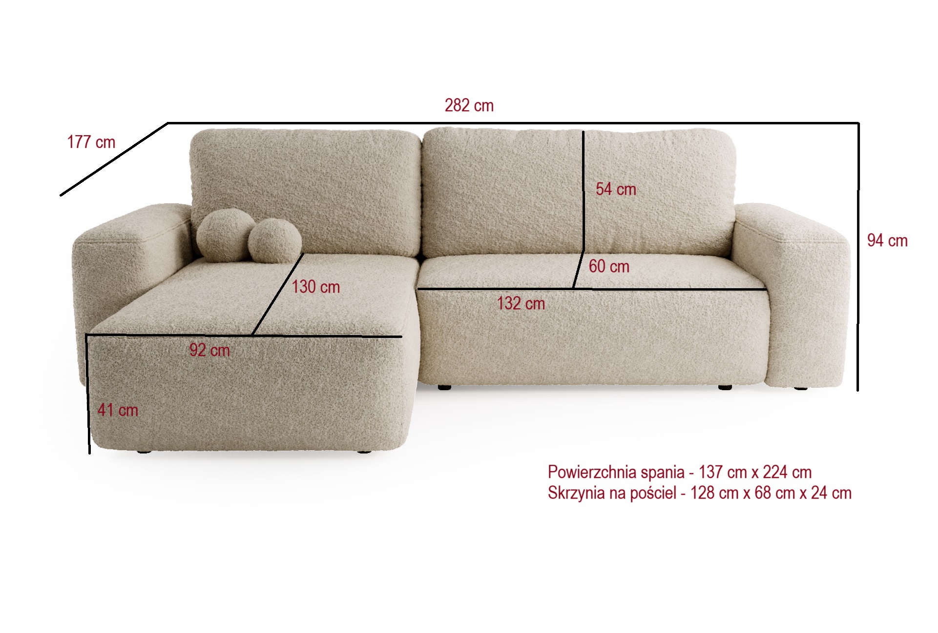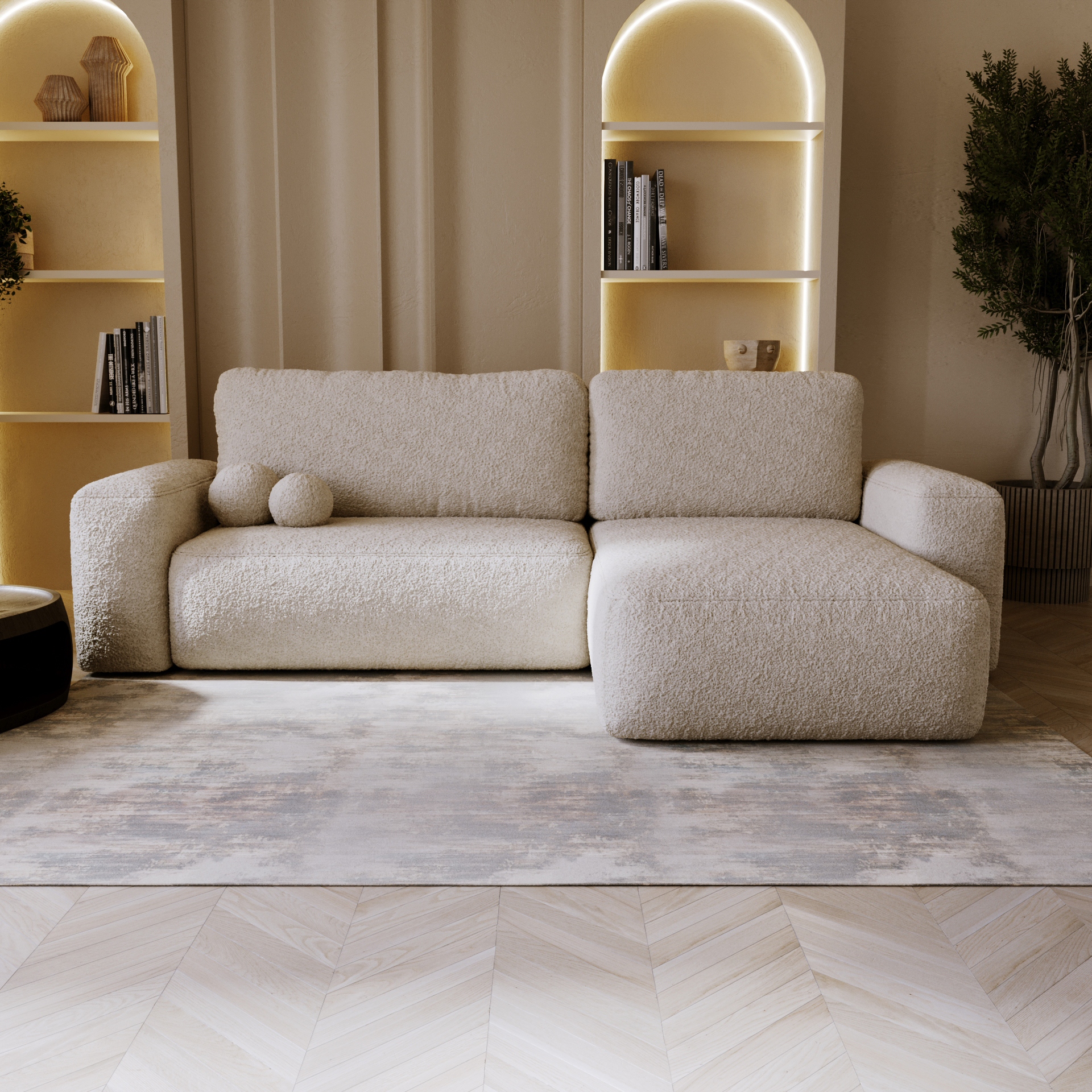 Bez wątpienia narożnik z funkcją spania SEVILLA L to eleganckie połączenie stylu i praktyczności, które idealnie sprawdzi się w każdym nowoczesnym salonie. Dodatkowo dzięki systemowi rozkładania DL, narożnik z łatwością zamienia się w wygodne miejsce do spania, a pojemnik na pościel pozwala na przechowywanie niezbędnych tekstyliów, zachowując porządek w pomieszczeniu. Tapicerka z tkaniny boucle quelle nadaje mu wyjątkowego charakteru i elegancji, a dołączone poduszki wypełnione granulatem zapewniają komfort podczas codziennego użytkowania.