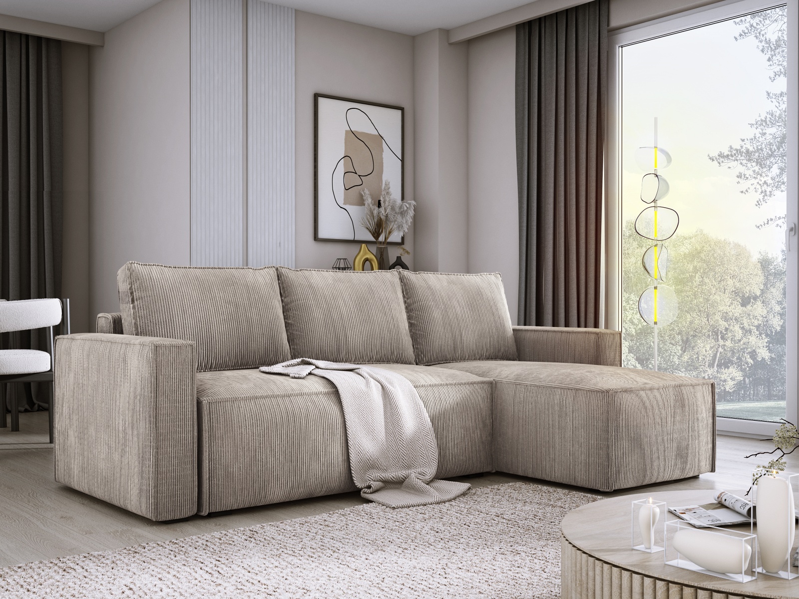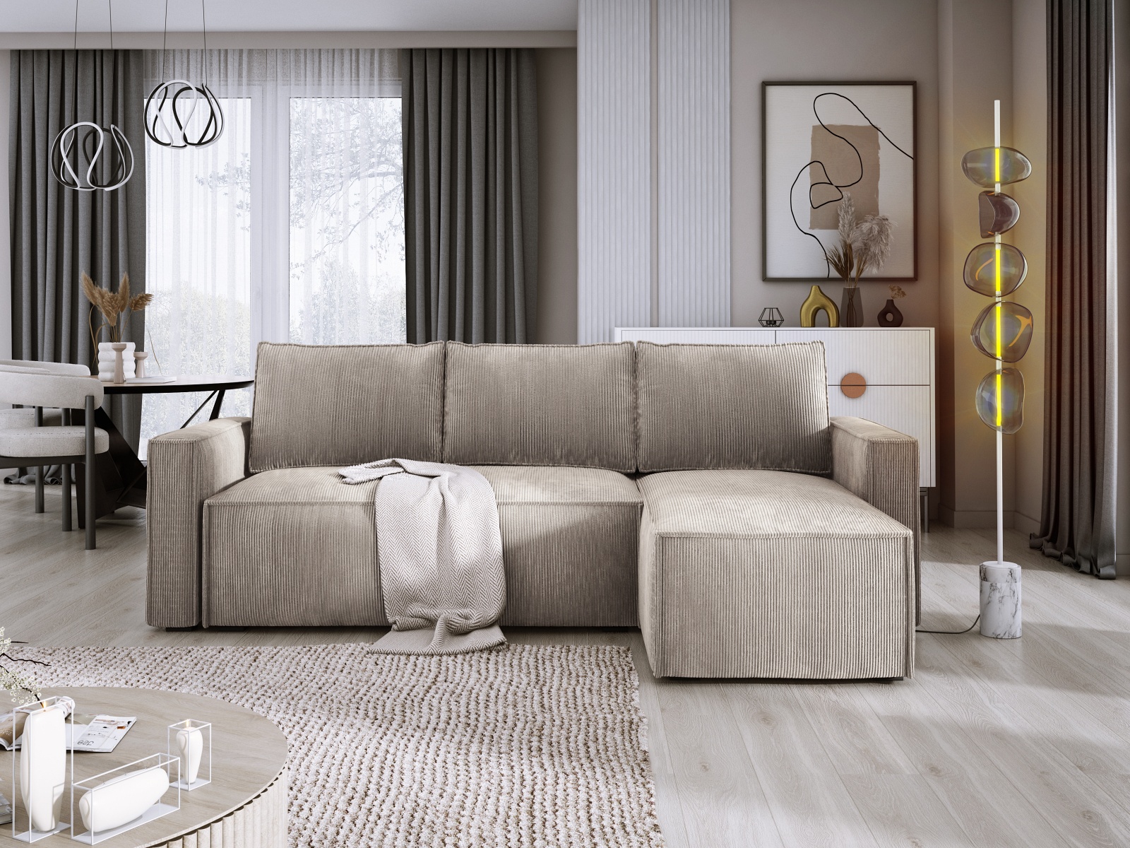 Warto zwrócić uwagę na wysokiej jakości tkaninę stylizowaną na sztruks, która przyciąga wzrok swoją fakturą. Miękkie prążki nie tylko podkreślają nowoczesny charakter mebla, ale również dodają wnętrzu przytulności. Dodatkowo, narożnik Kenzo sztruks dzięki zastosowaniu pianki poliuretanowej i sprężyn falistych w siedzisku i oparciu, oferuje nieporównywalny komfort siedzenia. Docenisz ten komfort każdego dnia – zarówno podczas krótkiej przerwy, jak i długiego relaksu po pracy.