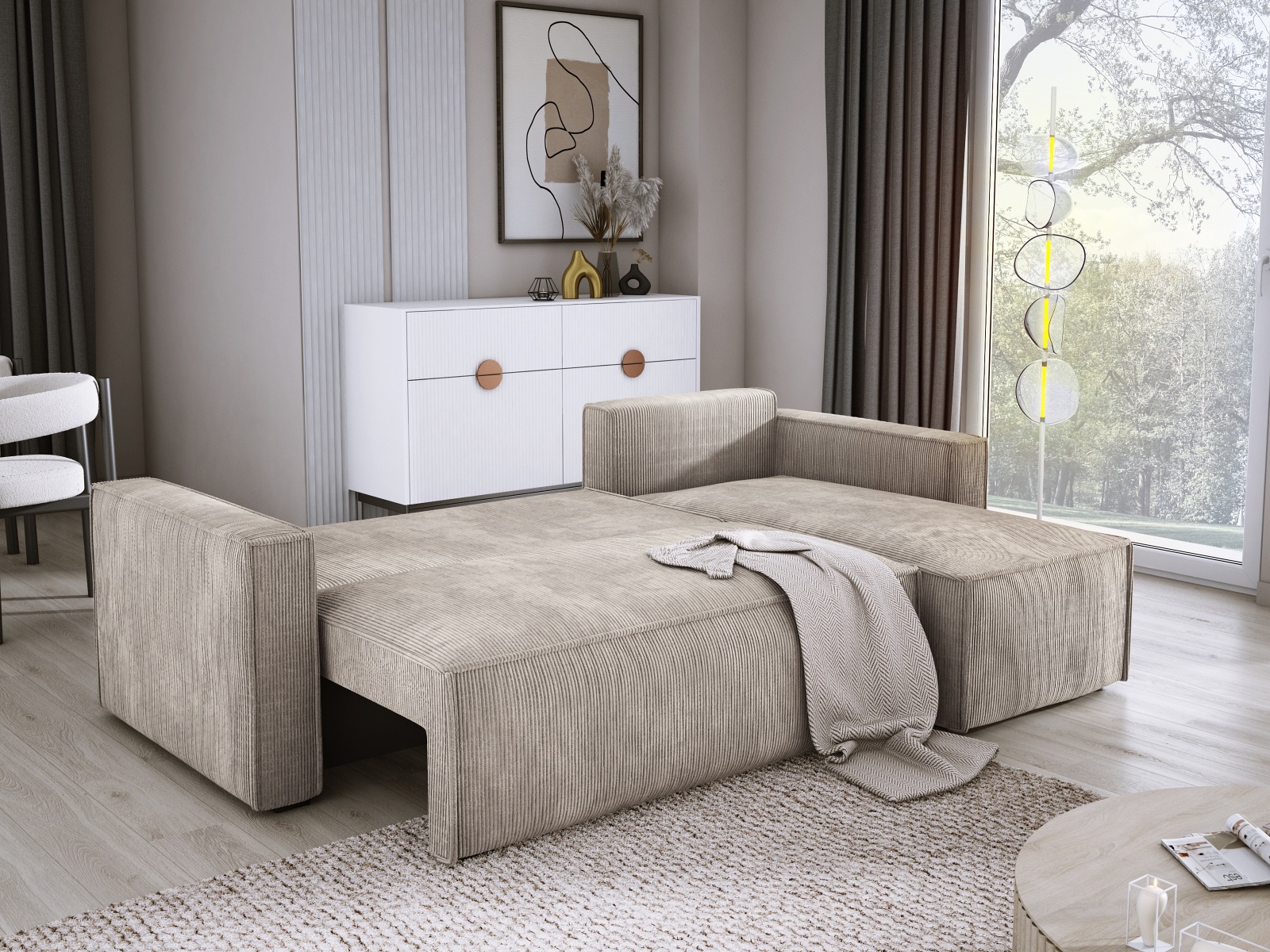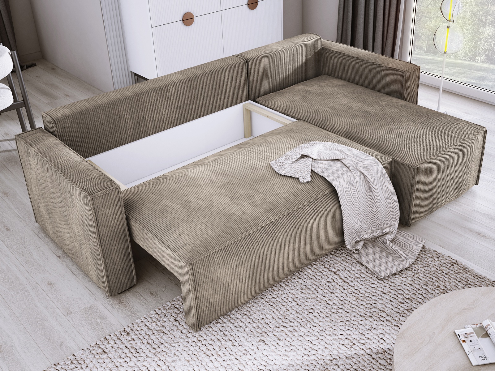 Z myślą o praktyczności, narożnik wyposażono w funkcję spania, dzięki której w szybki i prosty sposób zmienisz go w wygodne łóżko. Co istotne, mebel zawiera także pojemny schowek na pościel, który doskonale sprawdzi się do przechowywania. Dzięki temu zyskujesz dodatkowe miejsce, nie rezygnując z estetyki swojego wnętrza.
