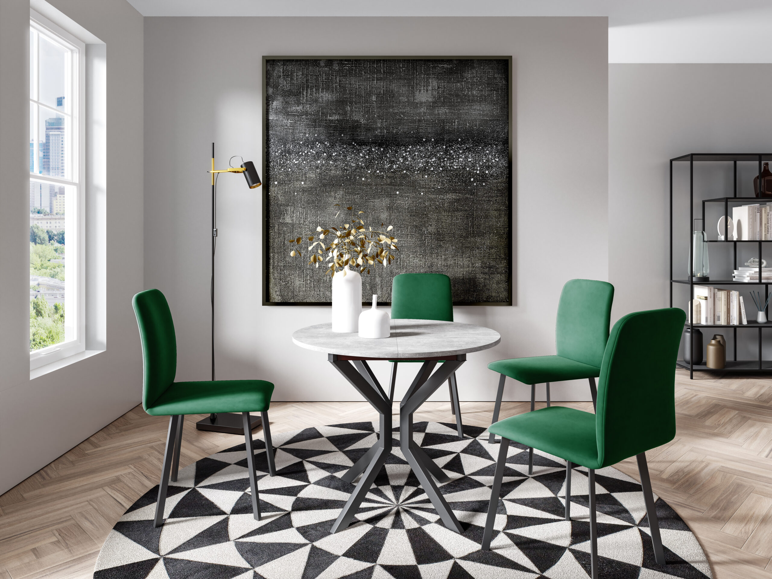 Stół okrągły rozkładany nowoczesny zachwyca swoim oryginalnym wyglądem. Przypadnie do gustu każdemu miłośnikowi współczesnego designu. To, co wyróżnia model od innych to z pewnością metalowe nóżki o ciekawym ułożeniu. Doskonale wpisze się w klasyczną, jak i nowoczesną czy minimalistyczną aranżację. Idealny stół do jadalni, kuchni i salonu.