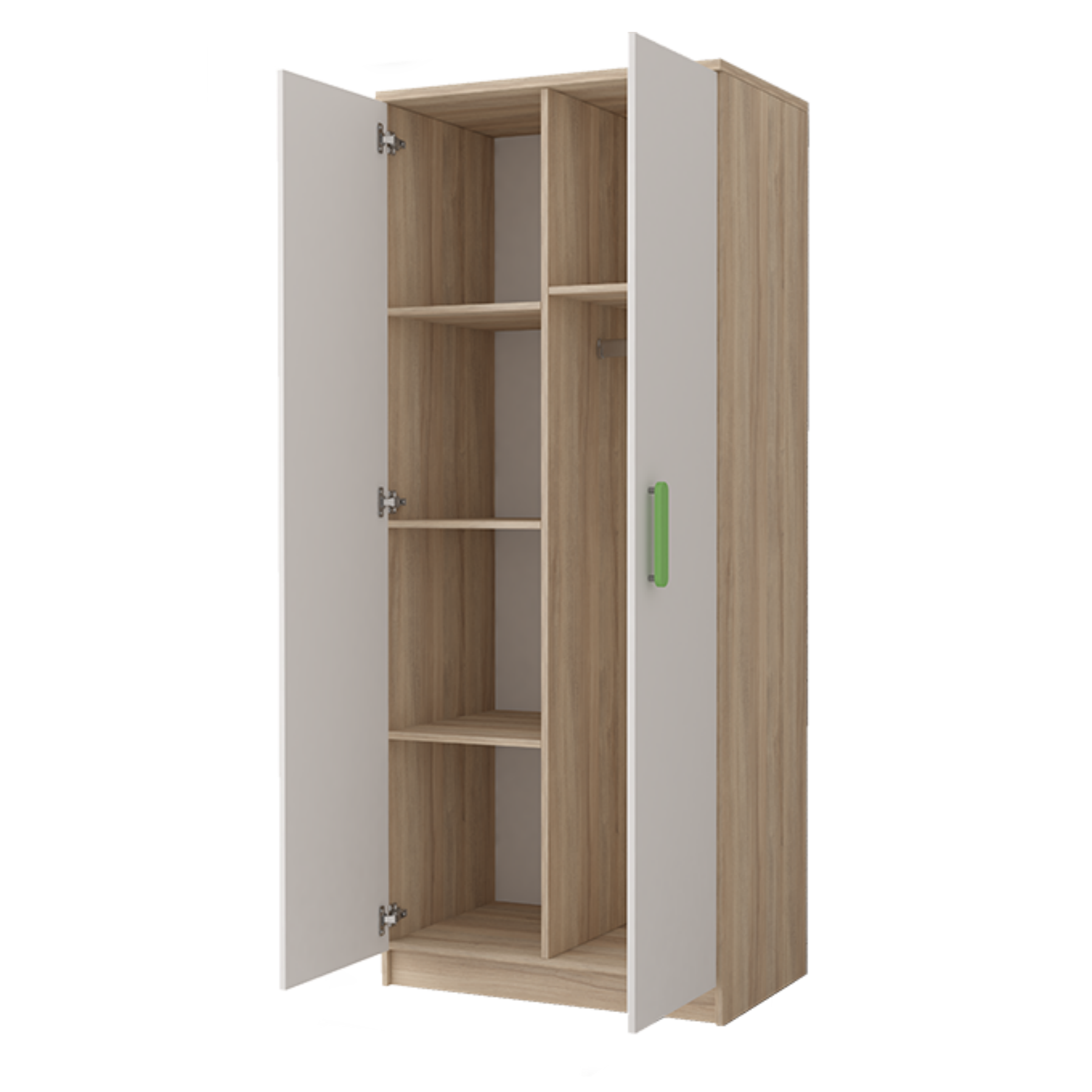 Mebel ten wyposażony został bowiem w parę wysokich drzwi, półkę oraz obszerną wnękę z drążkiem ubraniowym. Dzięki takiemu rozwiązaniu znajdziesz tutaj zaskakująco wiele miejsca, aby odpowiednio zorganizować swoje ubrania i dodatki, część rozwieszając na wieszakach, część składając w kostkę, a część umieszczając w pudełkach lub organizerach.