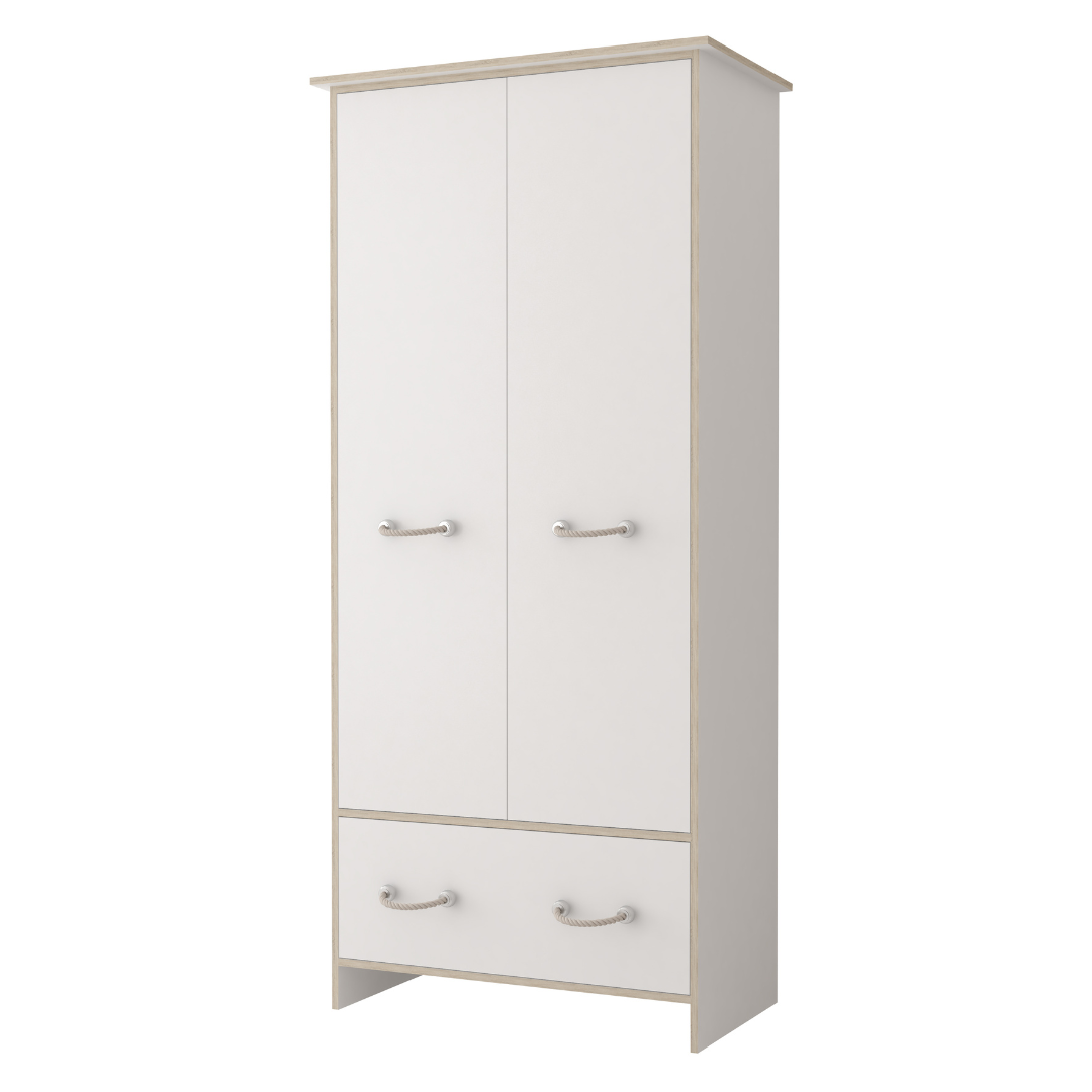 Meble z kolekcji FLARON charakteryzują dekoracyjne uchwyty sznurkowe w stylu marynarskim. Korpus i fronty wykonane są z płyty laminowanej 16 mm najwyższej jakości. Obrzeża wykończone okleiną ABS, która chroni meble przed zarysowaniami, uszkodzeniami, wilgocią i wysoką temperaturą. Korpus oraz fronty wykonane są w kolorze białego matu. Obrzeża mebli natomiast są w kolorze dąb sonoma. Komplet składa się z brył takich jak: biurko, regał, komoda, szafa, stolik nocny, łóżko o powierzchni spania 90×200 cm oraz stelaż drabinkowy do łóżka.