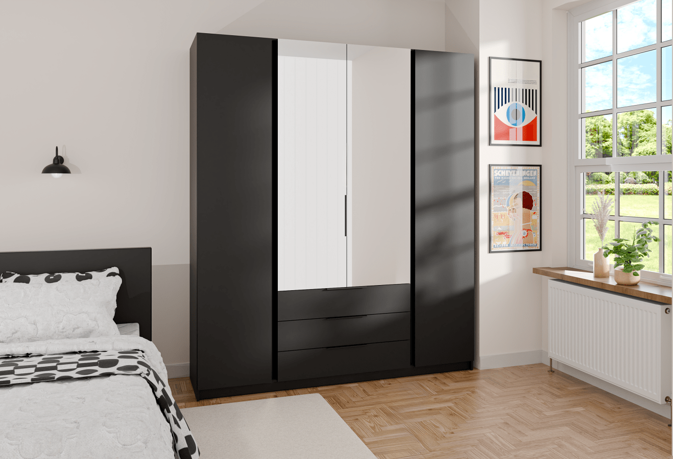 Bez wątpienia Szafa Mokka III to doskonały wybór dla osób ceniących nowoczesny design połączony z funkcjonalnością. Ten model wyróżnia się przede wszystkim czterodrzwiową konstrukcją oraz trzema pojemnymi szufladami na prowadnicach Quadro, które zapewniają wyjątkową płynność pracy i wytrzymałość na duże obciążenia. Gładkie fronty wykończone w modnej kolorystyce, uzupełnione o metalowe uchwyty krawędziowe, dodają szafie stylowego charakteru i sprawiają, że mebel prezentuje się elegancko i nowocześnie. Szafa Mokka III idealnie wpisuje się w różnorodne aranżacje wnętrz, od sypialni, przez pokój dziecięcy, aż po przedpokój.