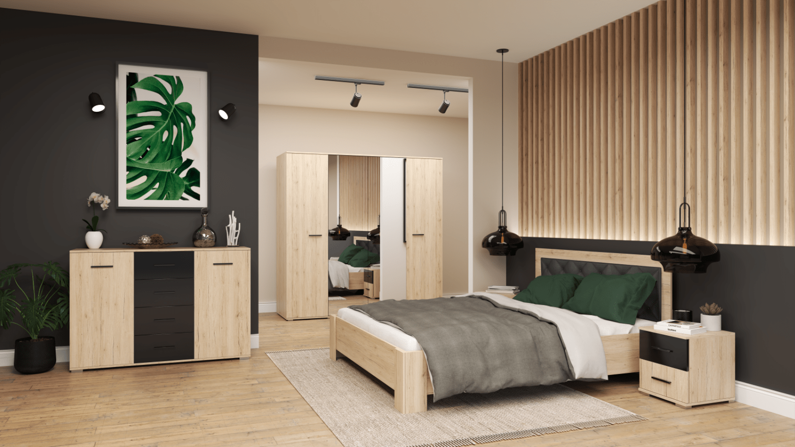 Bezsprzecznie Szafa Naomi to idealny wybór dla osób, które cenią funkcjonalność połączoną z estetyką. Dzięki starannie przemyślanej konstrukcji i nowoczesnemu wzornictwu, mebel ten doskonale sprawdzi się zarówno w sypialni, jak i garderobie. Fronty otwierane tradycyjnie, wykonane z wysokogatunkowego laminatu, w połączeniu z eleganckimi lustrami na froncie, dodają wnętrzu lekkości i optycznie je powiększają. Całość utrzymana jest w kolorystyce san remo sand z czarnym połyskiem, co nadaje szafie wyjątkowego stylu.