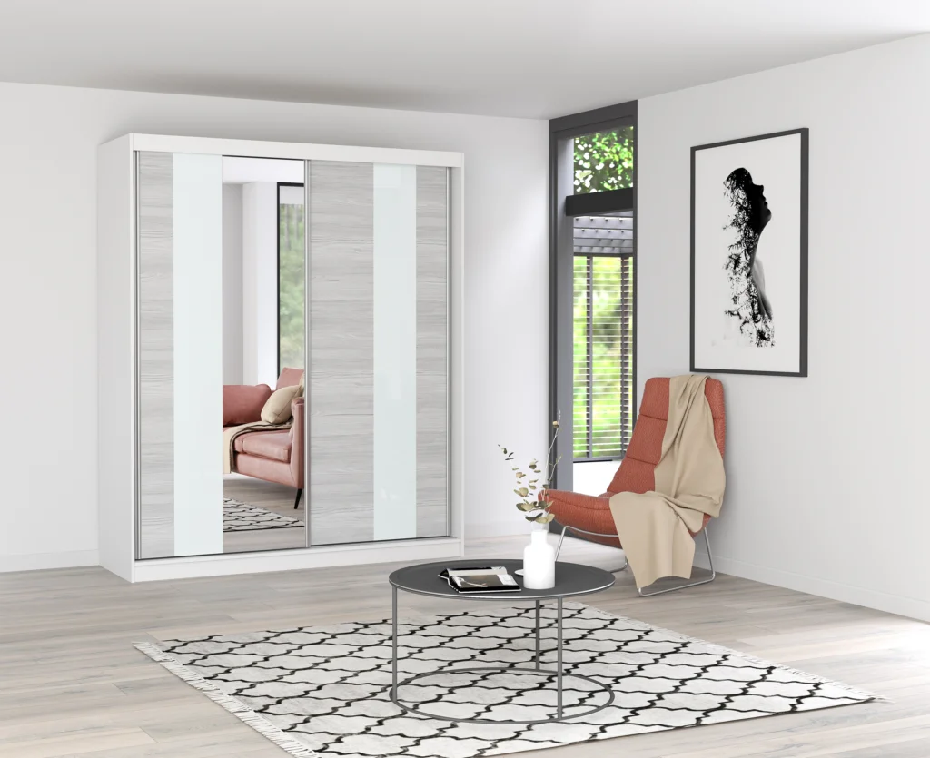 Bez wątpienia Szafa Nubia 32 z frontem w dekorze Kathult, ozdobiona eleganckim lustrem i stylową wstawką z białego szkła lacobel, doskonale odnajdzie się w nowoczesnych aranżacjach wnętrz. Dodatkowo dzięki systemowi drzwi przesuwnych codzienne użytkowanie staje się niezwykle wygodne, a konstrukcja nie zabiera dodatkowej przestrzeni – co jest szczególnie istotne w mniejszych pomieszczeniach.