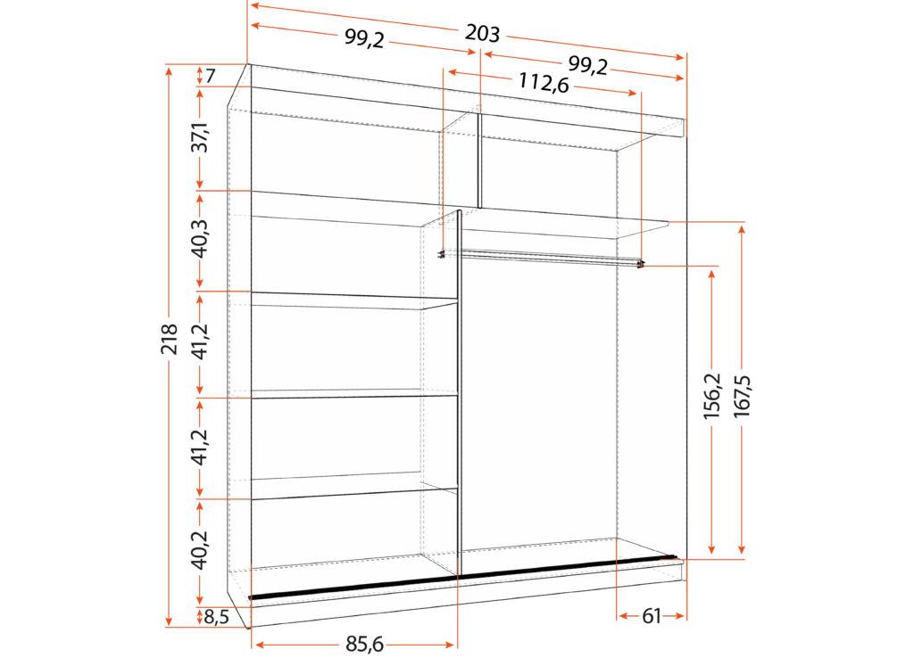 Wnętrze Szafy Nubia 42 zostało podzielone na dwie części. Dodatkowo wyposażono je w praktyczne półki oraz drążek na ubrania, umożliwiający wygodną organizację garderoby. Co więcej, zastosowany w szafie solidny system drzwi przesuwnych z metalowymi prowadnicami oraz rolkami na łożyskach zapewnia ciche i lekkie przesuwanie drzwi bez żadnych problemów.