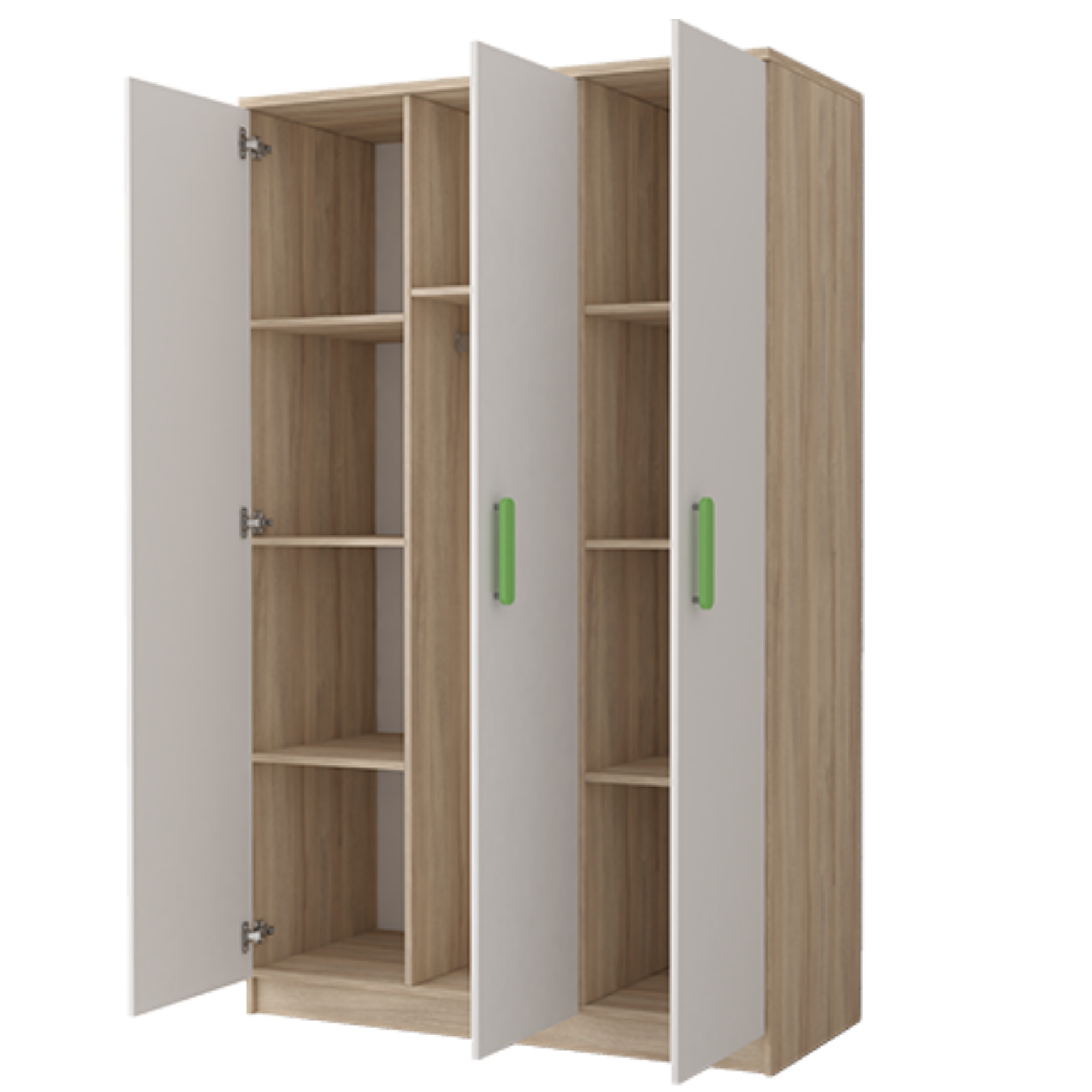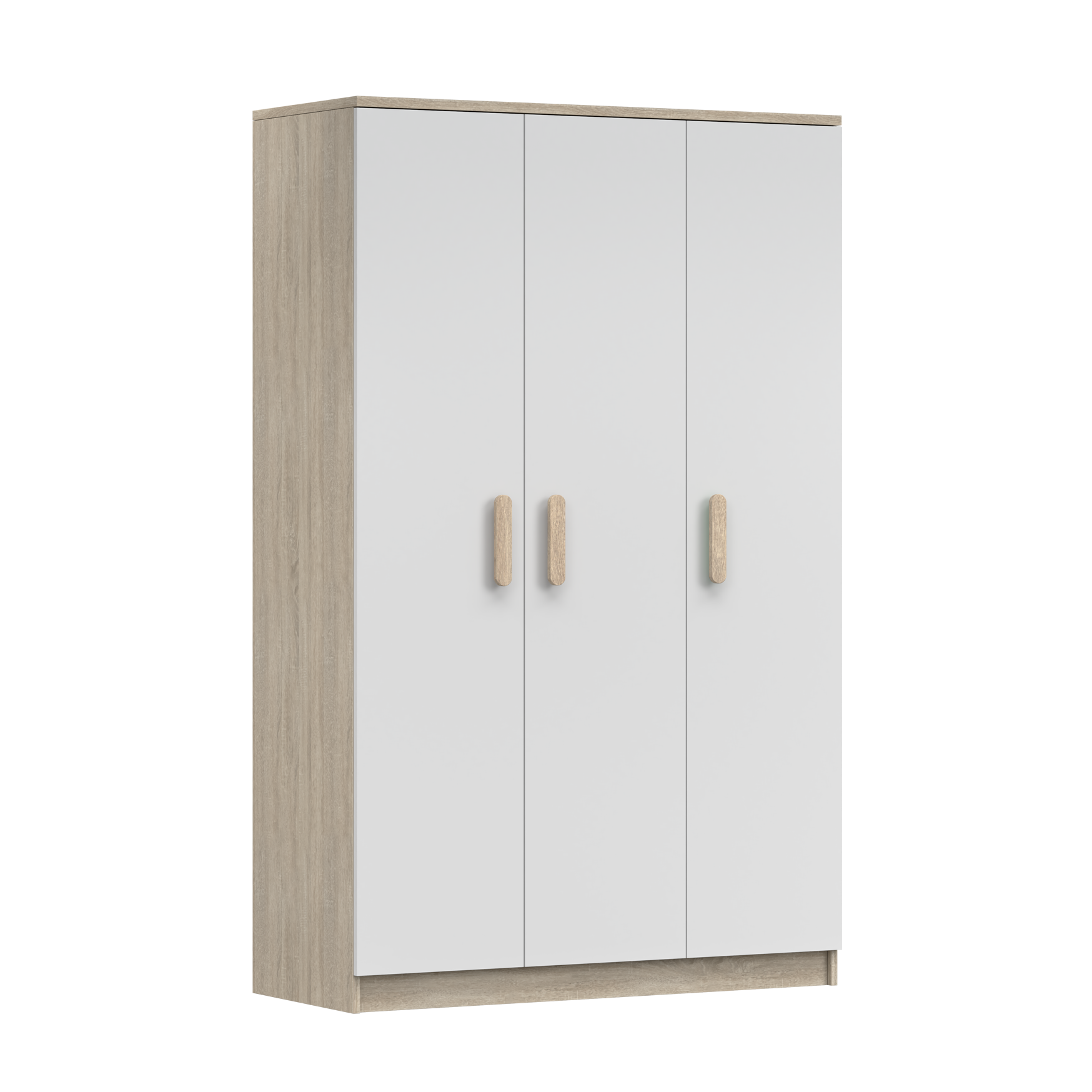 Szafa trzydrzwiowa została podzielona na dwie przestrzenie z półkami, które pozwolą rozdzielić odzież dwóch osób lub pomieścić pełną garderobę nawet najbardziej wymagającego użytkownika. Trzecia przestrzeń z drążkiem umożliwi powieszenie świeżo wyprasowanych ubrań i utrzymanie ich bez zagnieceń.