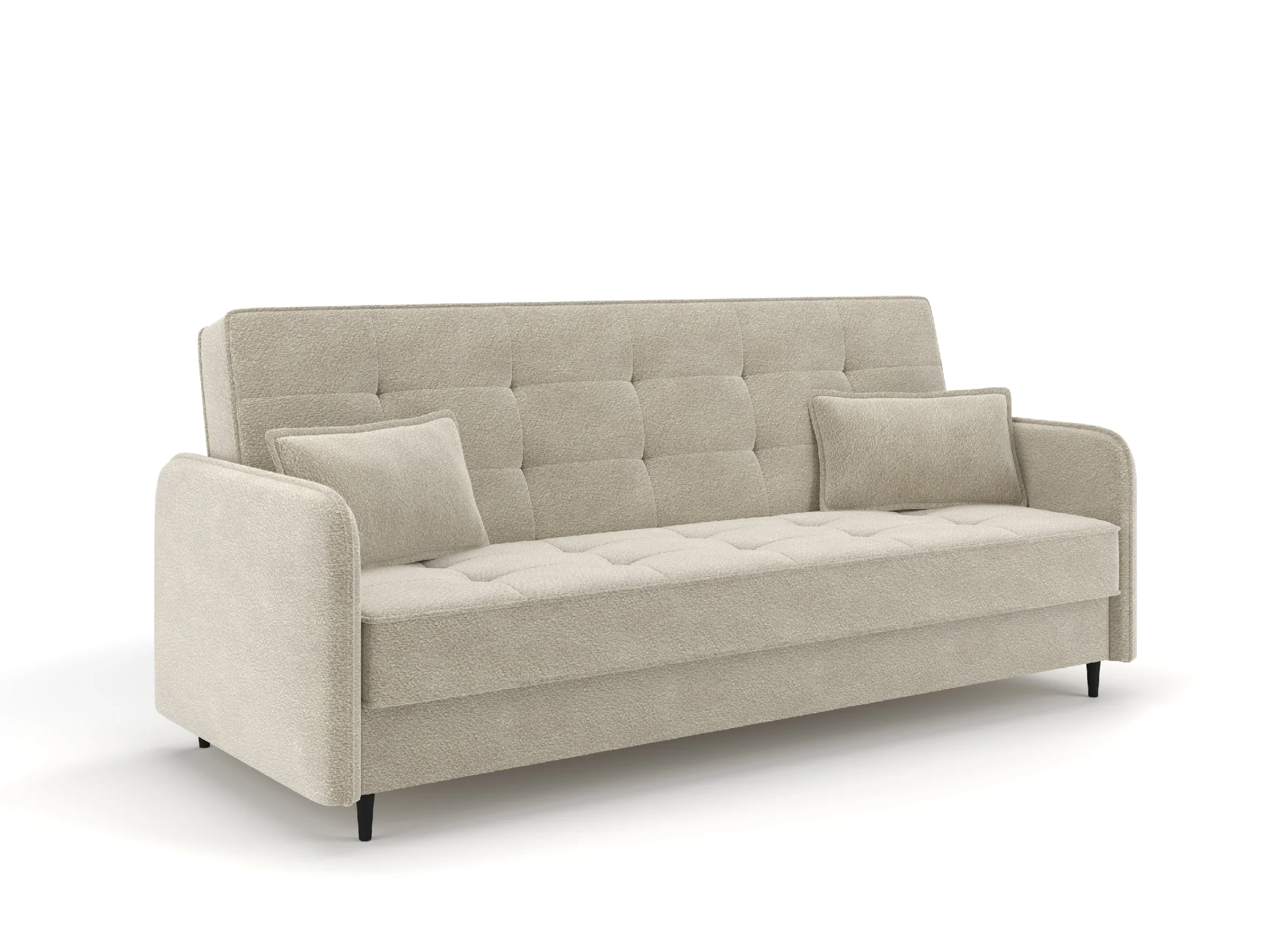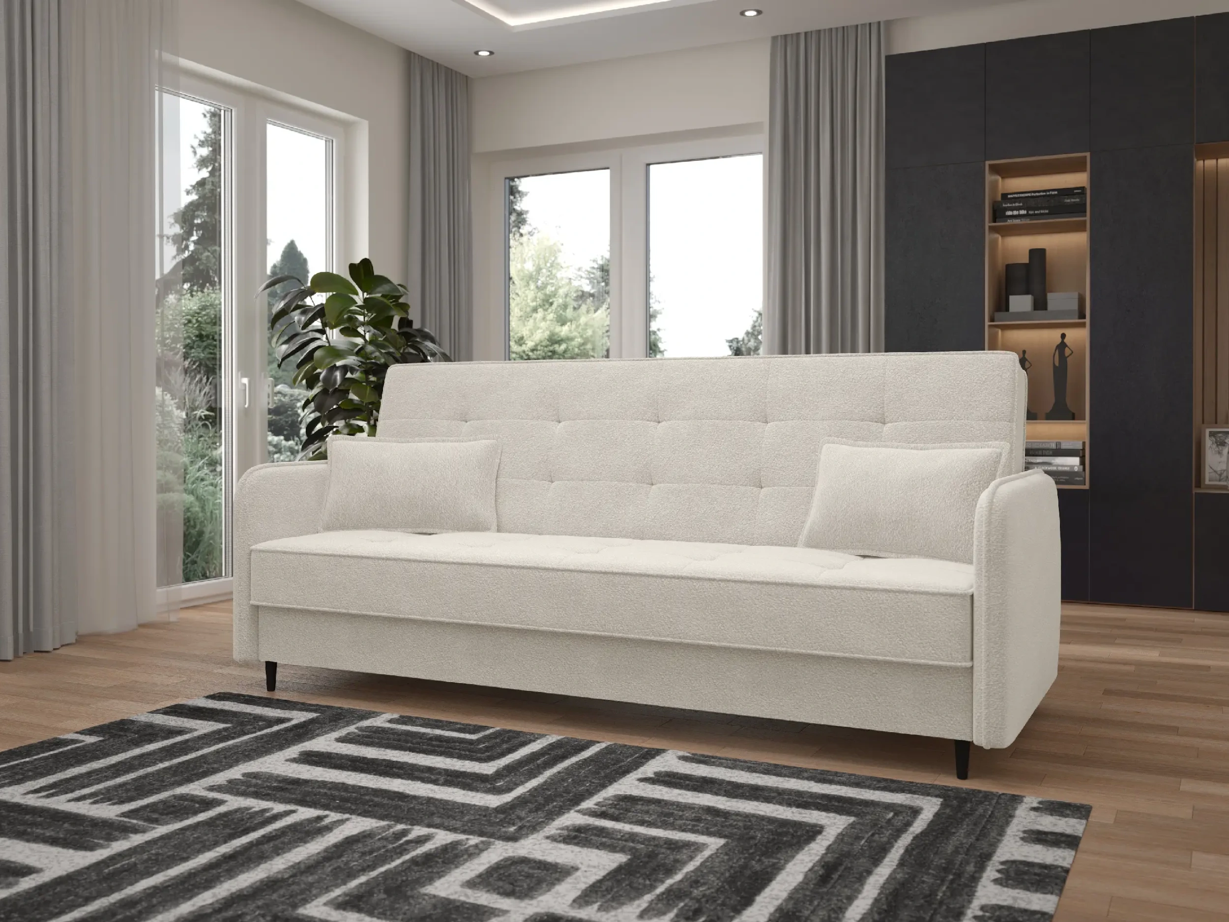 Bez wątpienia Wersalka Lara to doskonałe rozwiązanie dla osób, które cenią sobie komfort, estetykę oraz praktyczne funkcje w jednym meblu. Jej nowoczesny, a jednocześnie subtelny design podkreśliliśmy przez miękką i przyjemną w dotyku tkaninę bouclé, która nadaje wnętrzu wyjątkowego ciepła i przytulności. Dzięki temu model świetnie sprawdzi się zarówno w aranżacjach minimalistycznych, jak i bardziej klasycznych.