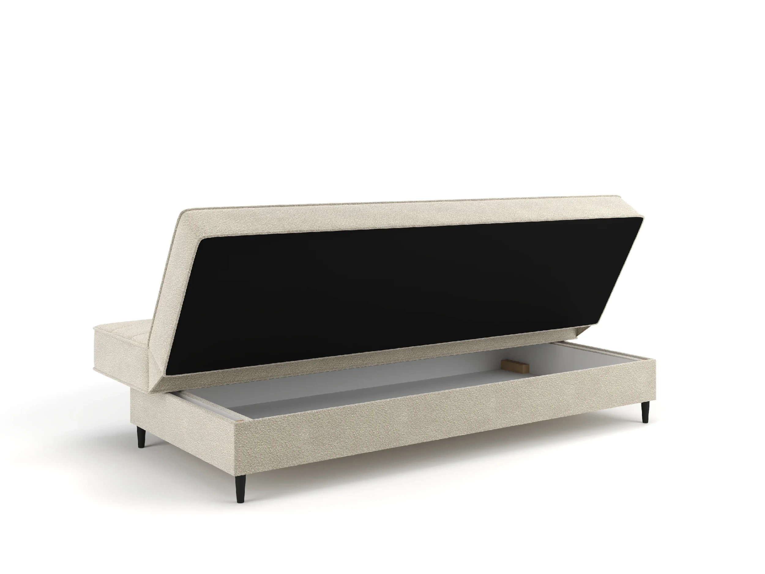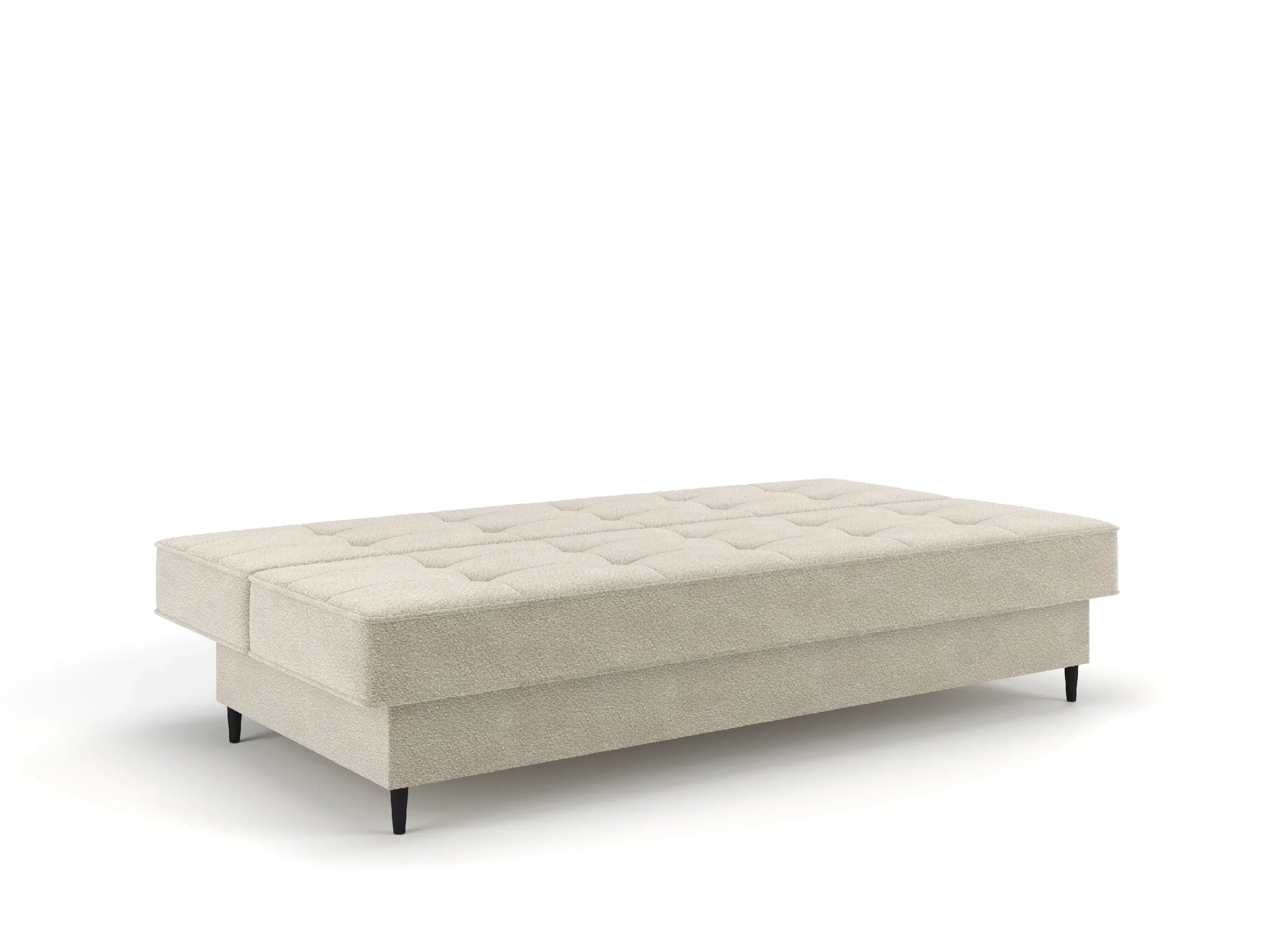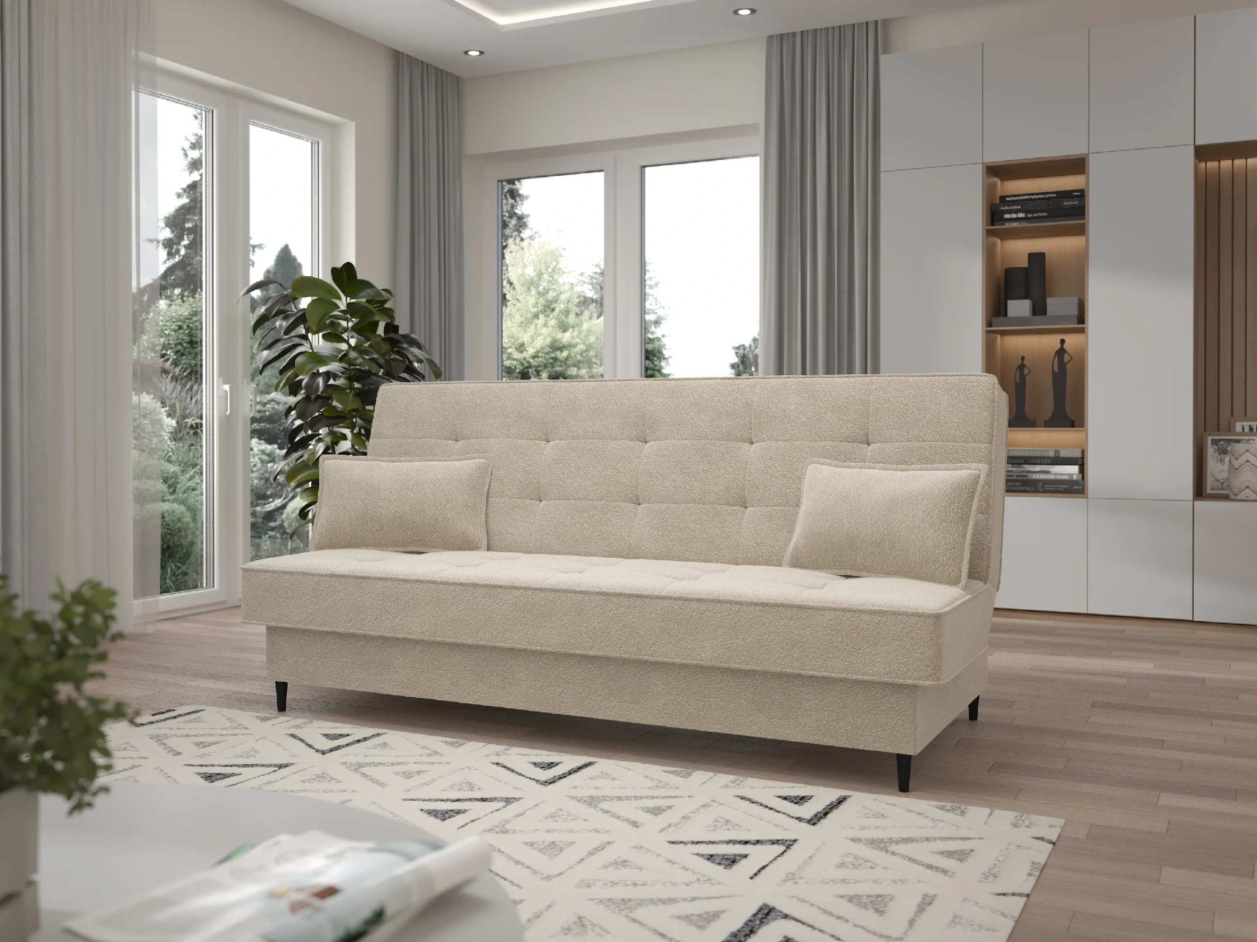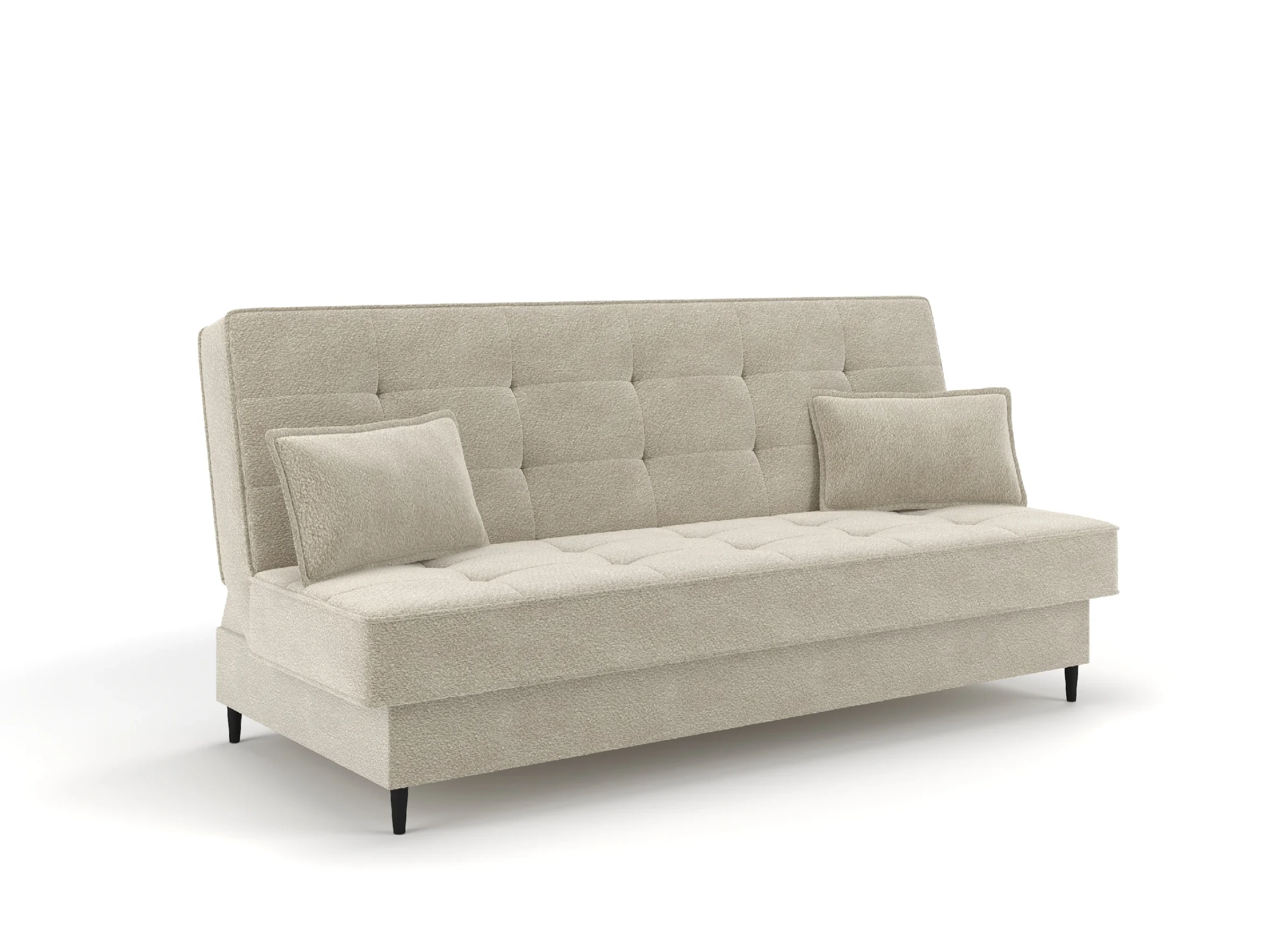 Model wyposażyliśmy w praktyczną funkcję spania z mechanizmem Klick-Klak. Umożliwia on szybkie i wygodne rozłożenie wersalki, a tym samym tworzy wygodne miejsce do nocnego odpoczynku. Sprężyny bonellowe zastosowane zarówno w siedzisku, jak i oparciu zapewniają wyjątkowy komfort oraz trwałość na lata, a dodatkowe poduszki typu jasiek zwiększają wygodę codziennego użytkowania. Pojemnik na pościel pod siedziskiem pozwala praktycznie przechowywać koce, poduszki i inne tekstylia, co czyni mebel funkcjonalnym i estetycznym zarazem.