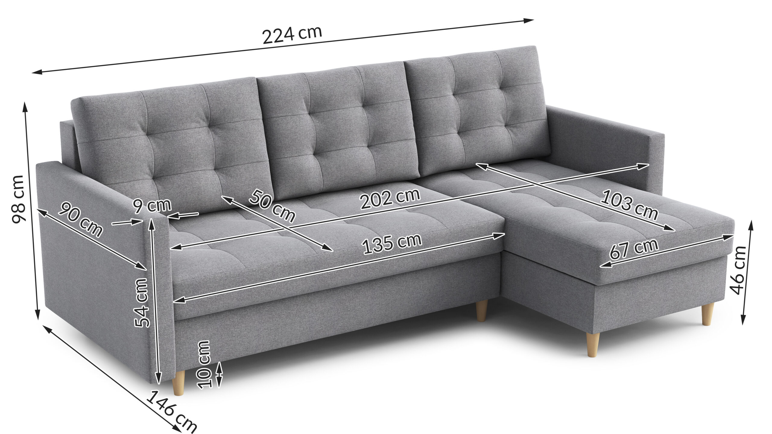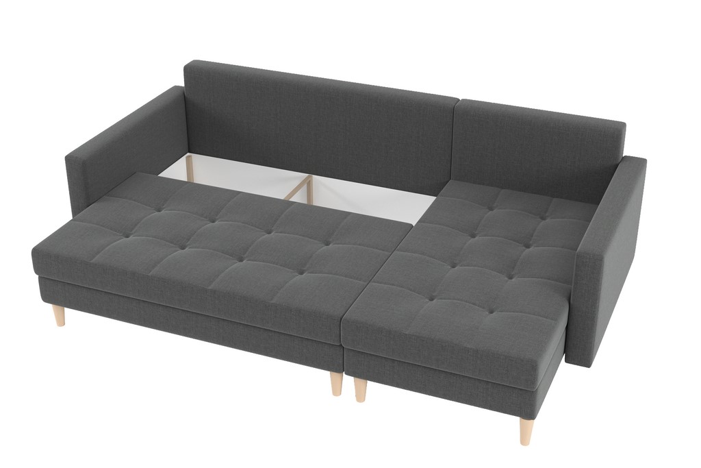 Nie bez znaczenia jest fakt, że narożnik Malmo został wyposażony w intuicyjny system rozkładania. Innymi słowy oznacza to, że zaledwie w kilka chwil możesz zmienić go w komfortowe łóżko dla gości lub domowników. Co więcej, praktyczny pojemnik na pościel pozwala na wygodne przechowywanie koców, poduszek czy zapasowej pościeli. W szczególności pozwala to zachować porządek bez konieczności korzystania z dodatkowej przestrzeni do przechowywania. Dodatkowym atutem tego modelu jest jego kompaktowy rozmiar, który – mimo niewielkich gabarytów – nie rezygnuje z wygody ani stylu.