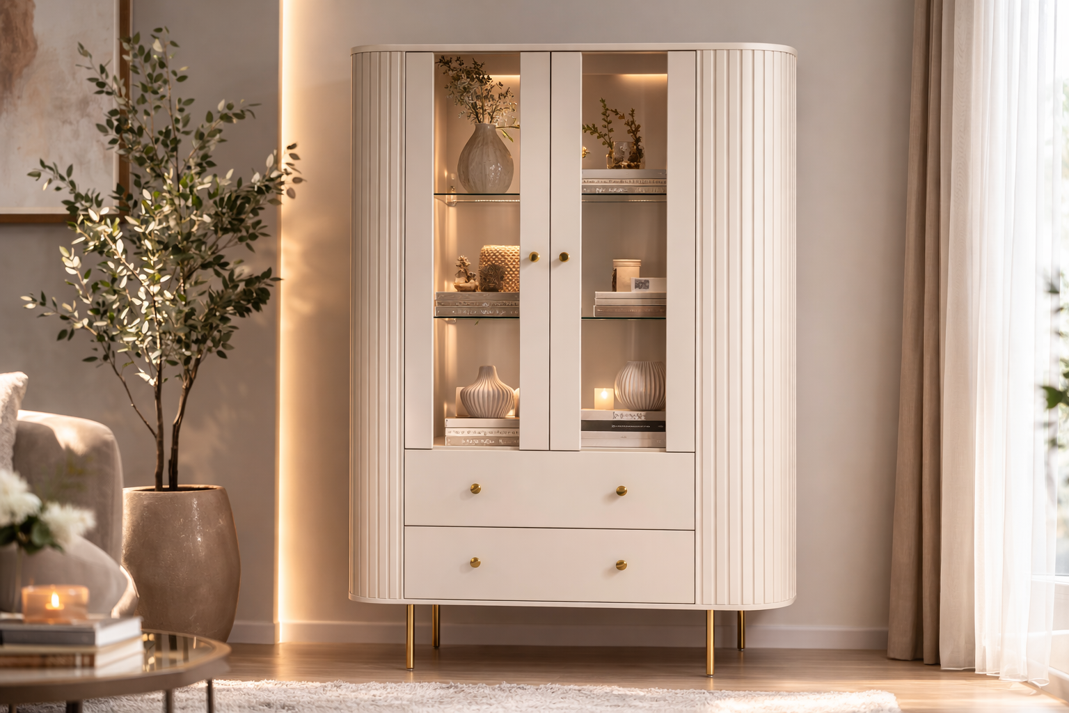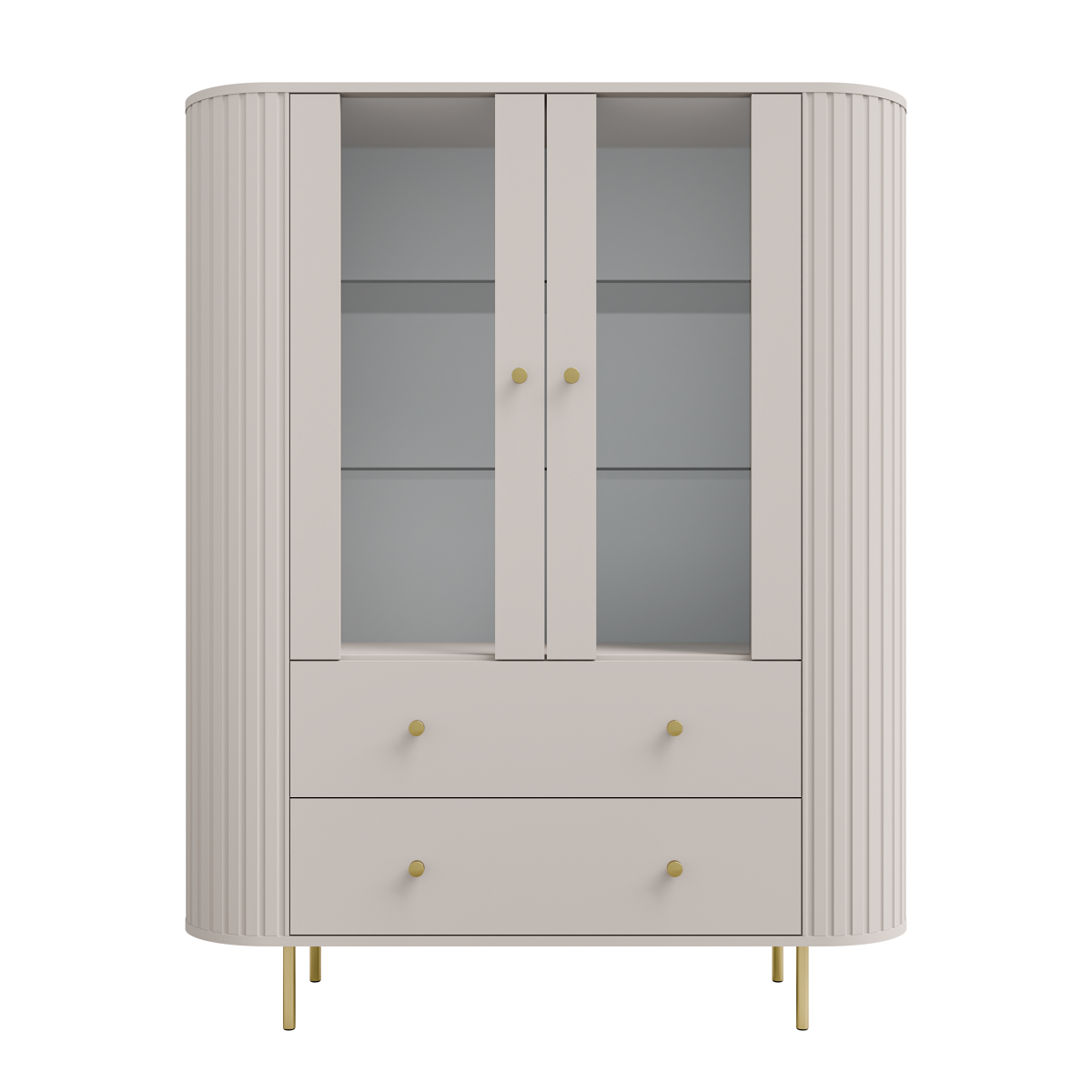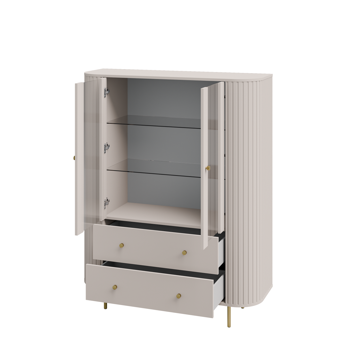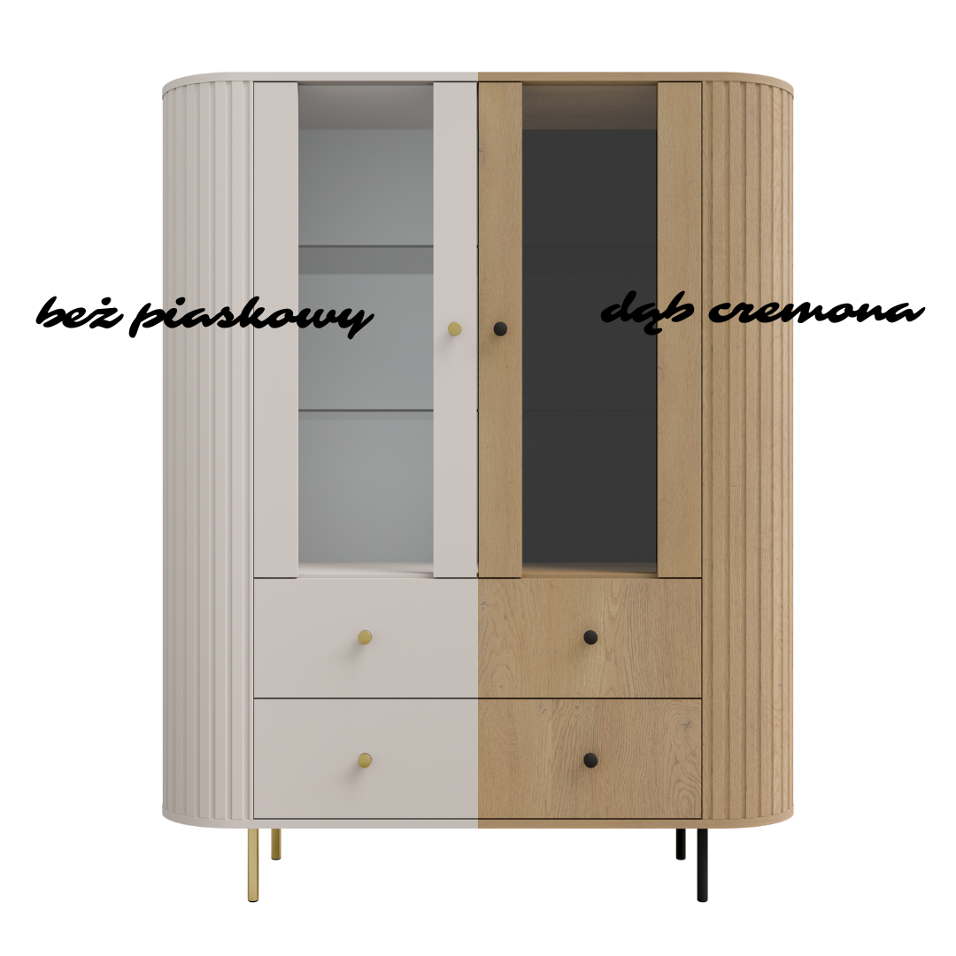Z pewnością witryna LAMELLE 122 to połączenie elegancji i funkcjonalności, dostępne w dwóch wariantach kolorystycznych. Wersja beż piaskowy + złote dodatki wprowadza do wnętrza lekkość i subtelną elegancję, natomiast dąb cremona + czarne dodatki nadaje aranżacji naturalny, cieplejszy charakter z wyrazistym, nowoczesnym kontrastem. Bez wątpienia ryflowane fronty podkreślają dekoracyjny styl mebla w obu odsłonach. To idealny wybór do salonu, jadalni lub gabinetu.